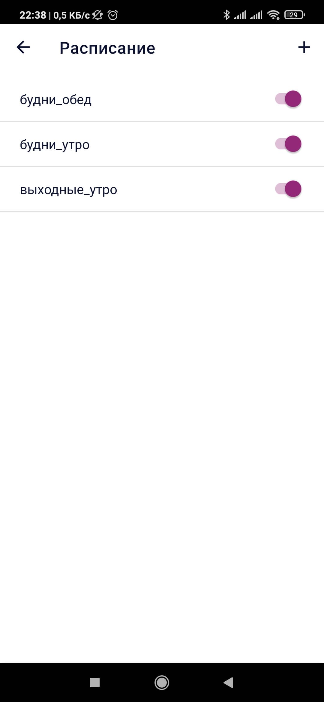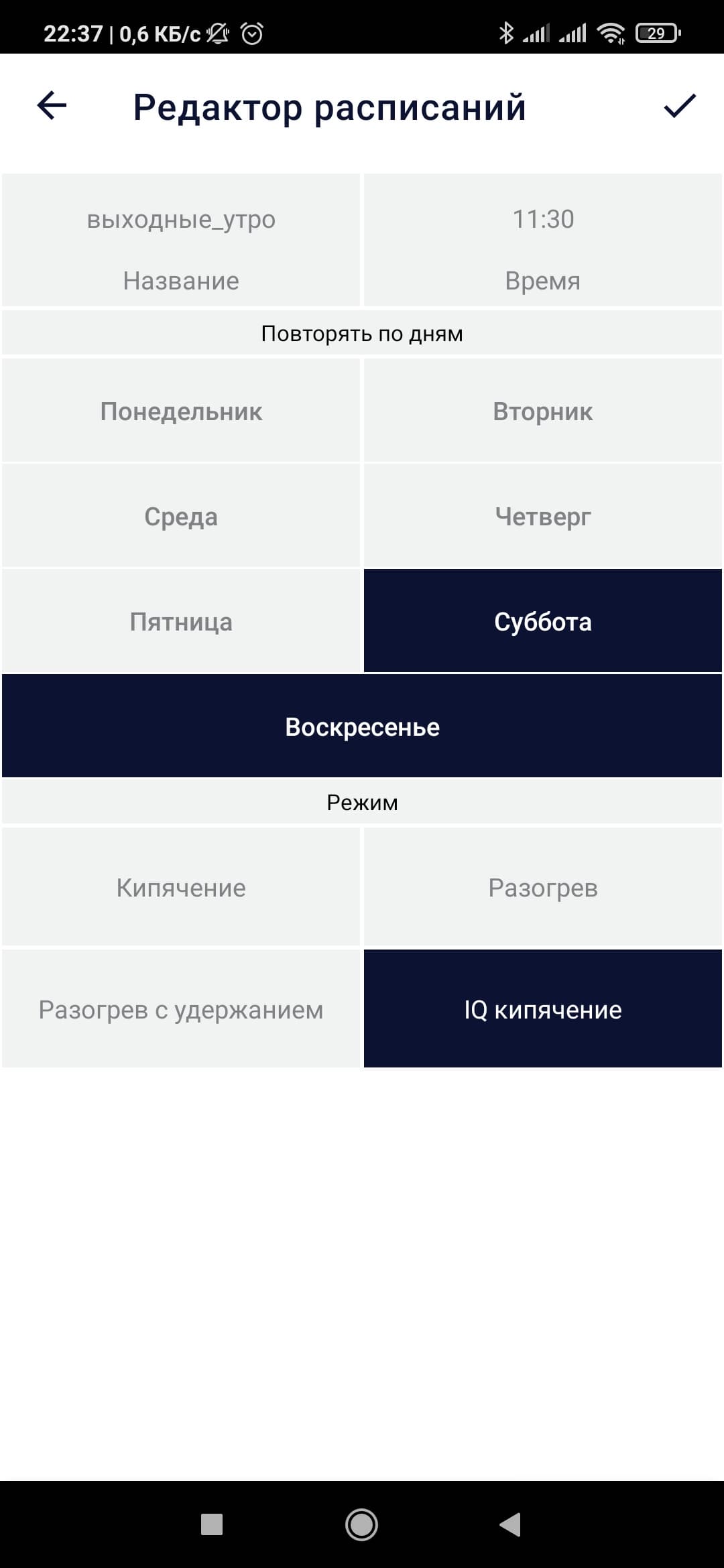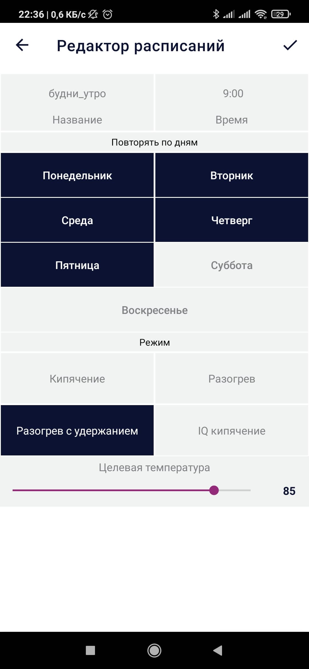 IQ Home позволяет задать время включения чайника (с точностью до минуты), температуру (30—100 °C, шаг — 5 °C) и режим нагрева. Для этого предназначен режим «Расписание». Можно программировать PWK-1712CGLD как на разовое включение, так и на периодическое.