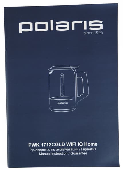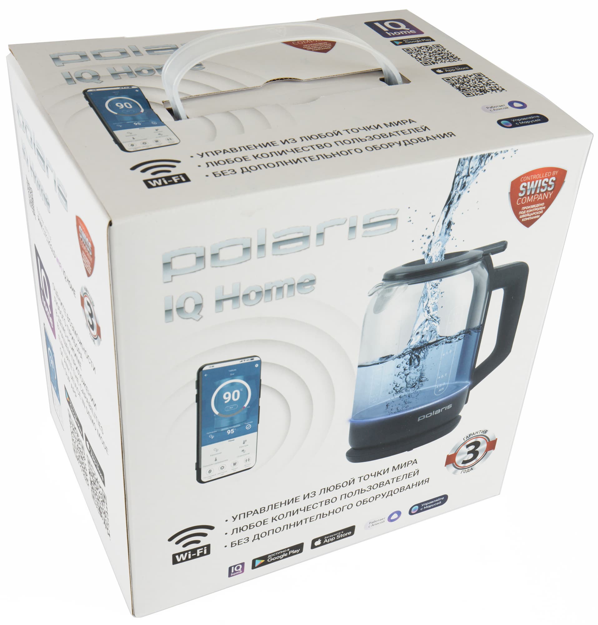 Чайник поставляется в компактной коробке из матового картона с ручкой. Помимо изображения прибора, на ней есть и некоторые его технические данные, хотя большая часть поверхности отдана под информацию о приложении Polaris IQ Home, в том числе QR-коды, по которым его можно скачать в Play Market или App Store. Впрочем, фотографии PWK-1712CGLD достаточно, чтобы понять, что у него есть подсветка, а воду можно заливать, не снимая крышку.