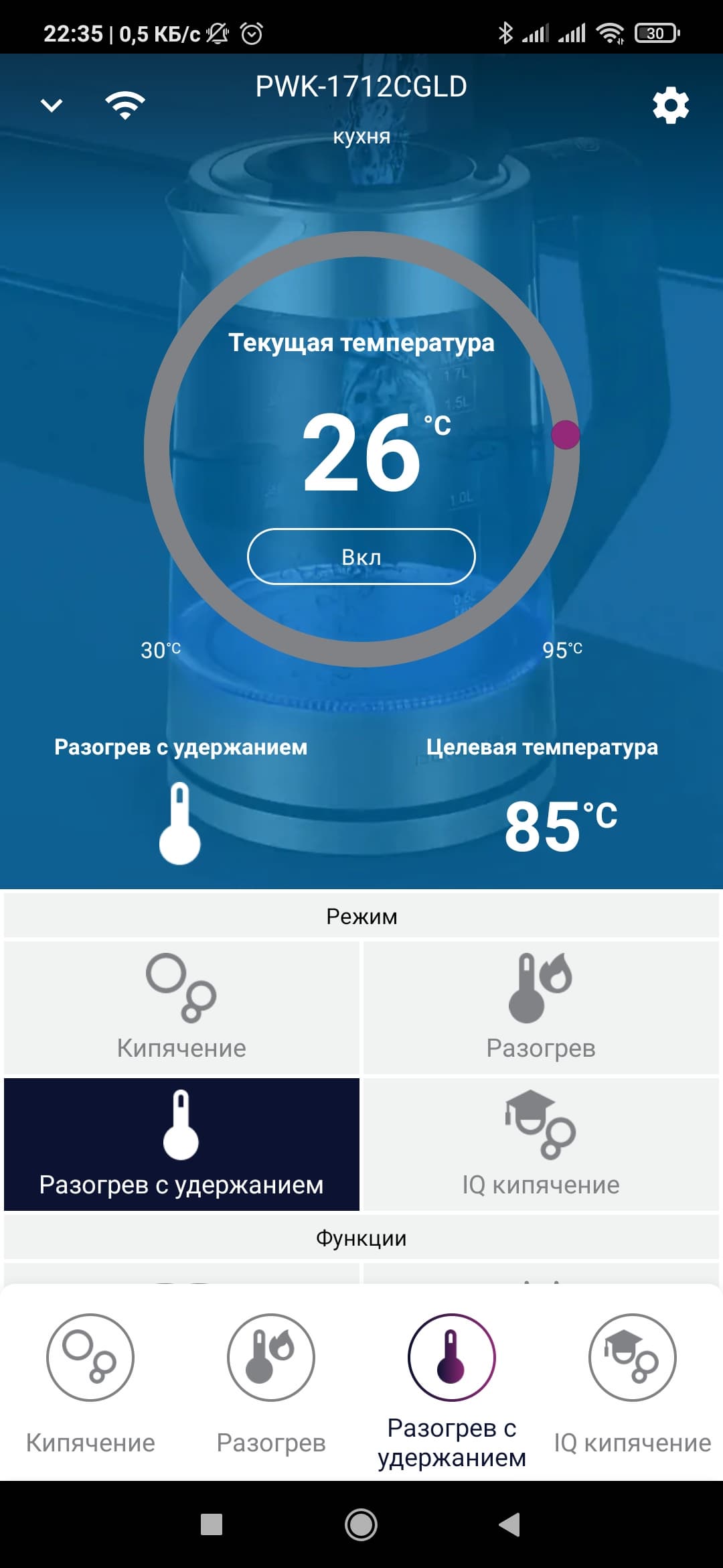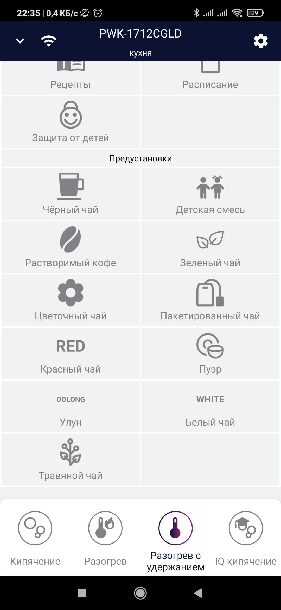Приложение IQ Home дает бо́льшую свободу в плане выбора температур, тут можно установить хоть 30 °C, хоть 95 °C или воспользоваться одним из предустановленных режимов. В приложении всегда можно посмотреть текущую температуру воды в колбе (жаль, что на самом чайнике нет такого индикатора) и запрограммировать чайник на включение по расписанию в нужном режиме. К сожалению, PWK-1712CGLD Wi-Fi IQ Home оказался обделен рецептами в приложении и функцией «Чайная церемония», которая не прерывает режим поддержания температуры после снятия чайника с базы.