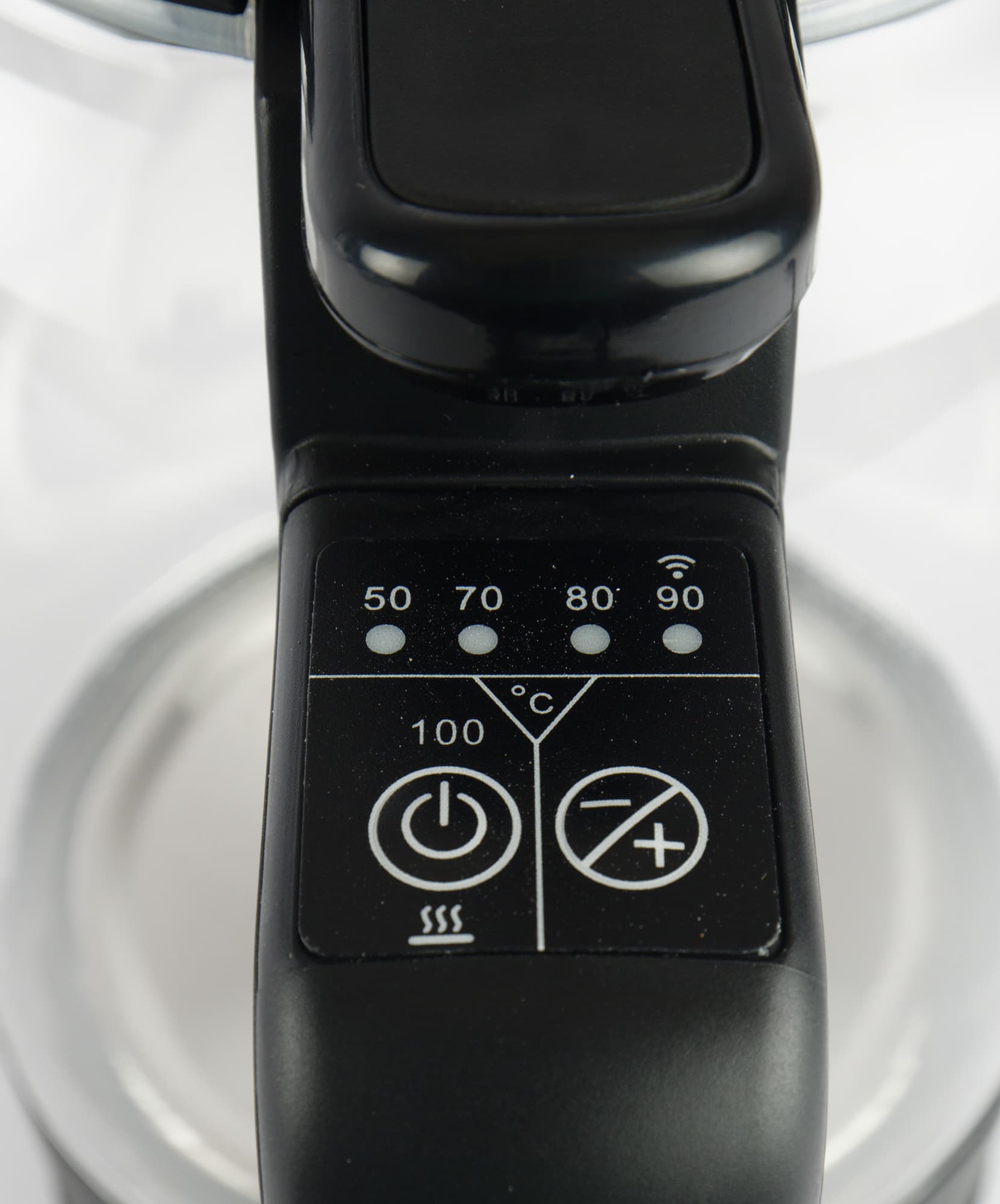 C помощью кнопки «+/−» устанавливается температура нагрева воды (50, 70, 80, 90 °C). О выбранном режиме сообщает не только горящий индикатор, но и цвет светодиодной подсветки. 50 °C — зеленый цвет, 70 °C — голубой, 80 °C — синий, 90 °C — фиолетовый, 100 °C — красный.