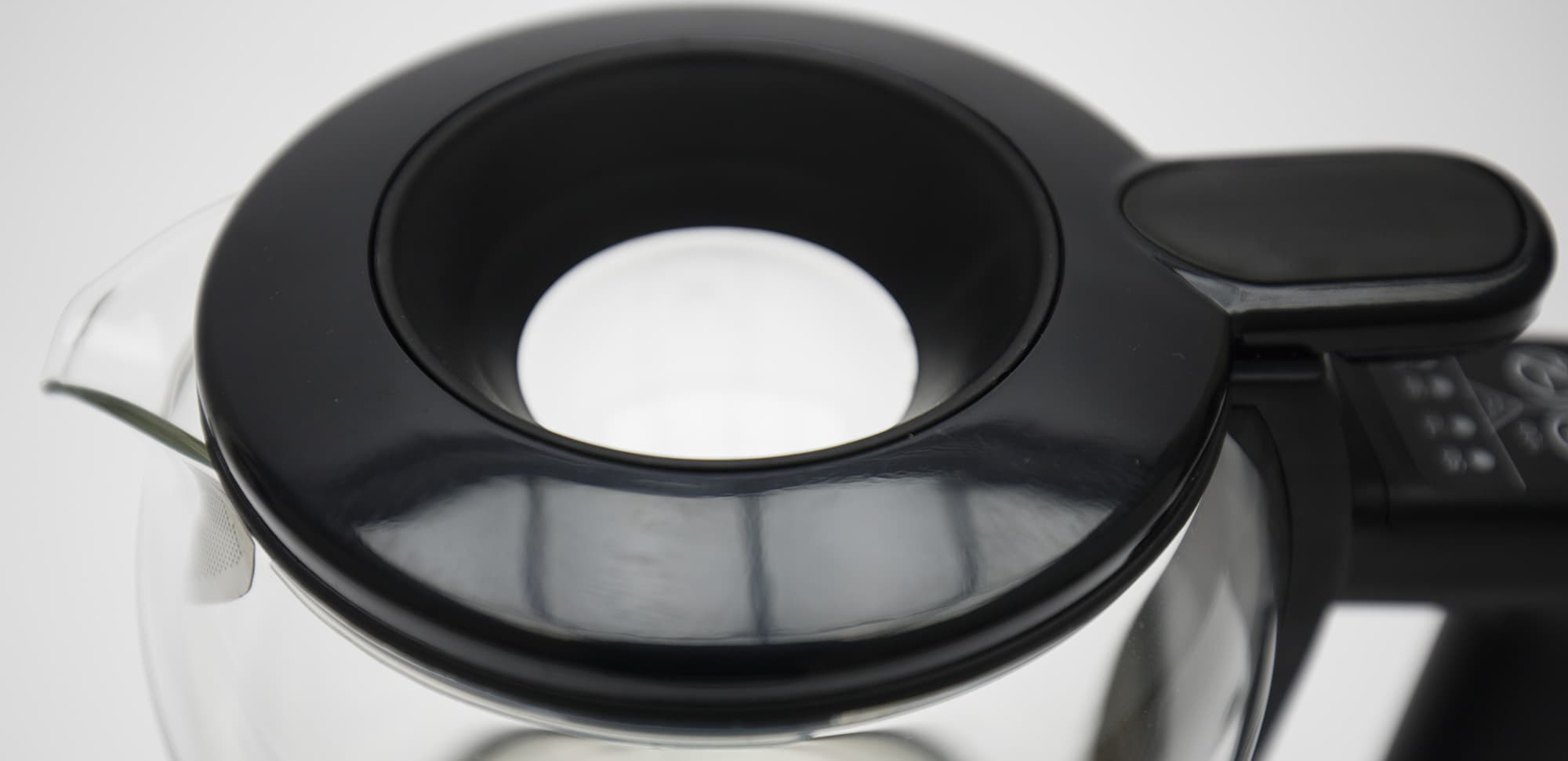Полностью снимающаяся крышка выделяется из общего ансамбля своей глянцевостью. В центре ее — подпружиненный клапан, через который в чайник заливается вода — это и есть та самая запатентованная система Water Pro. Плотное прилегание крышки к корпусу обеспечено силиконовой прокладкой. Положение крышки на корпусе одно — его подскажет расположение фильтра и ручки.
