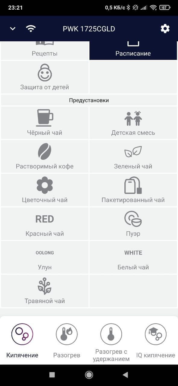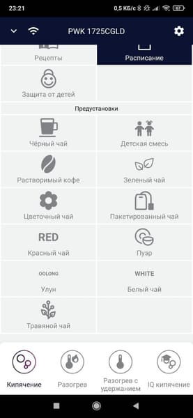 В качестве бонуса отметим наличие раздела «Рецепты», в котором содержится несколько десятков способов приготовить чай. При этом каждый рецепт позволяет автоматически запустить чайник в подходящем режиме.