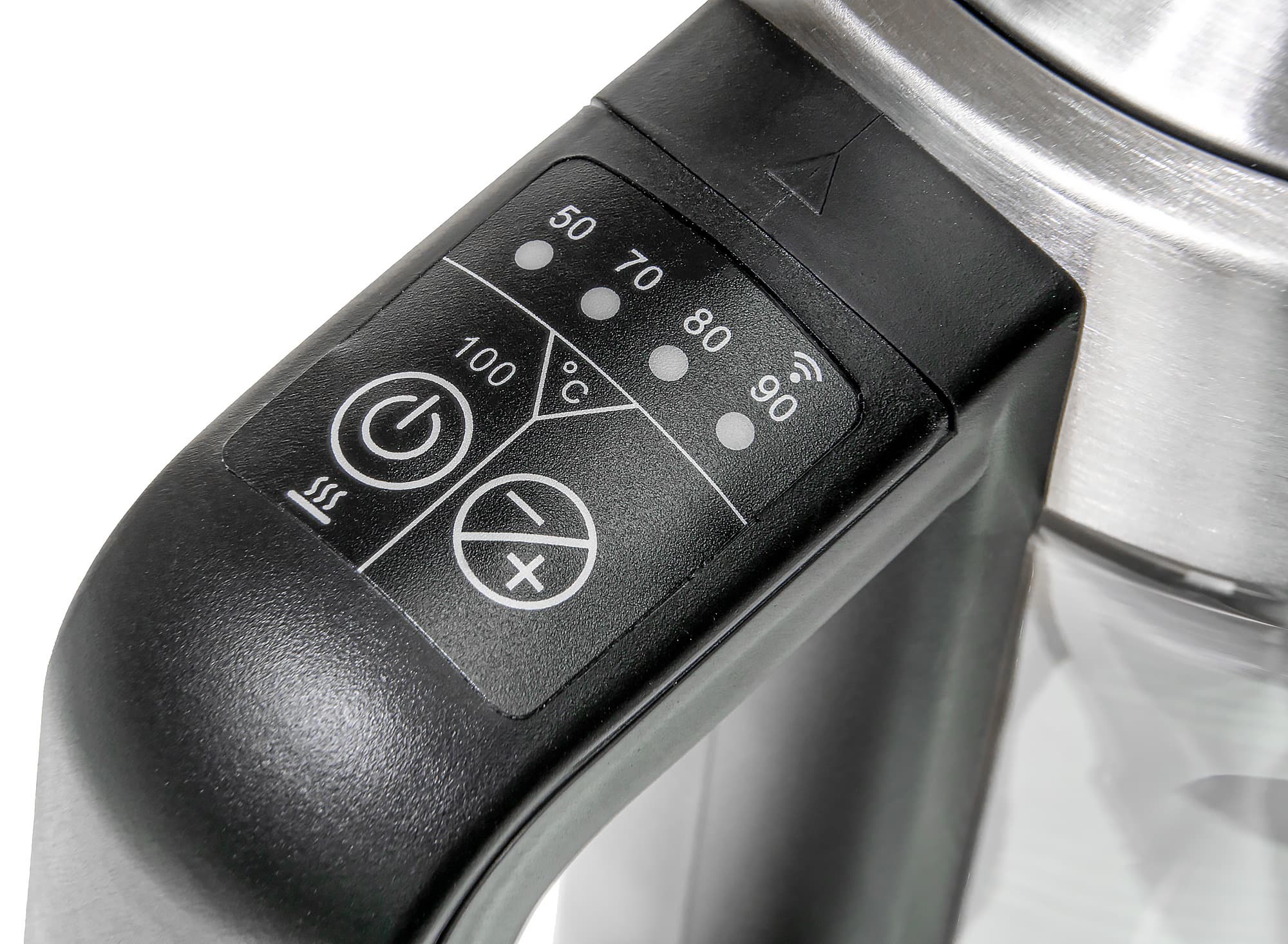 Чайник управляется с помощью двух кнопок, расположенных на ручке прибора. Для контроля за выбранным режимом используются светодиодные индикаторы (всего 4 штуки).