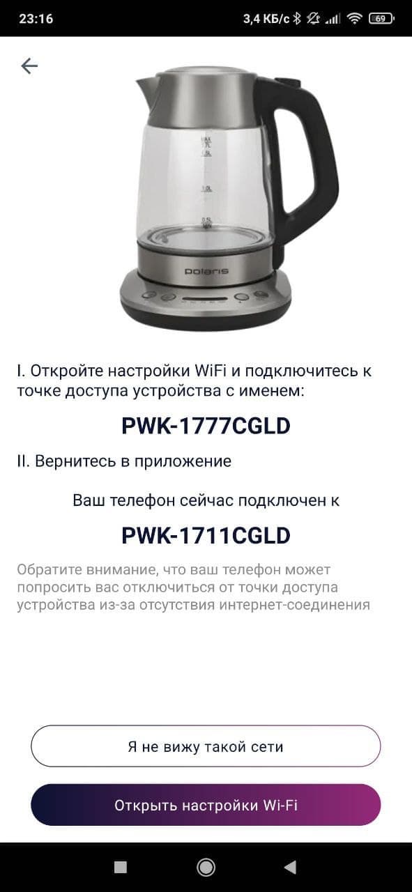 Процесс сопряжения стандартный — выбираем прибор из списка доступных устройств, подключаемся к чайнику с помощью смартфона, передаем информацию о домашнем Wi-Fi (название сети и пароль), после чего отключаемся.