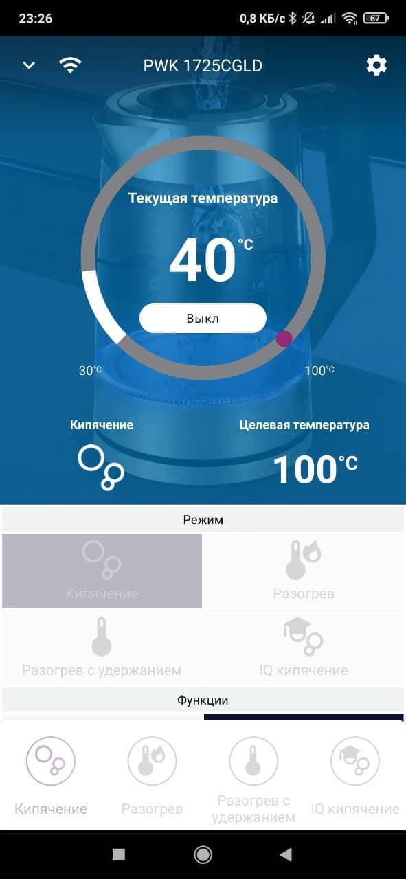 Все управление прибором осуществляется с главной странице приложения. Тут можно увидеть текущую температуру воды в чайнике, а в случае, если прибор включен — выбранный режим работы.