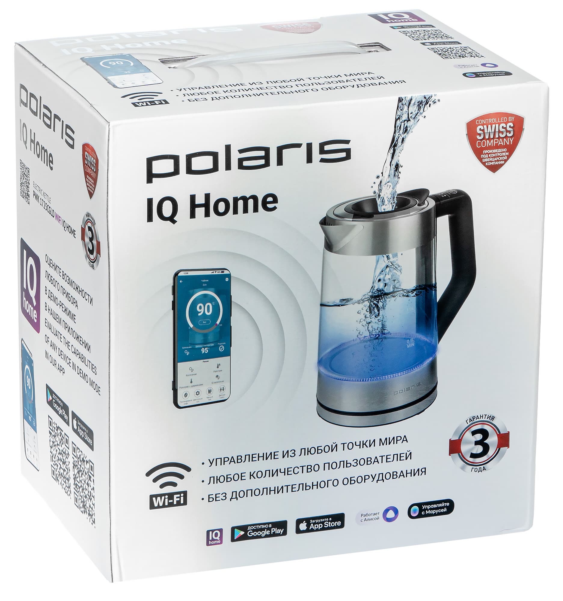 Чайник прибыл в нашу лабораторию в белой коробке с логотипом Polaris, полноцветным изображением самого прибора и подробным описанием возможностей устройства. Почти на каждой стороне упаковки — сообщения от том, что чайником можно управлять со смартфона по Wi-Fi и преимуществах такого способа. Также производитель делает особый акцент на наличии «революционной технологии залива воды» — с ней мы уже сталкивались ранее.