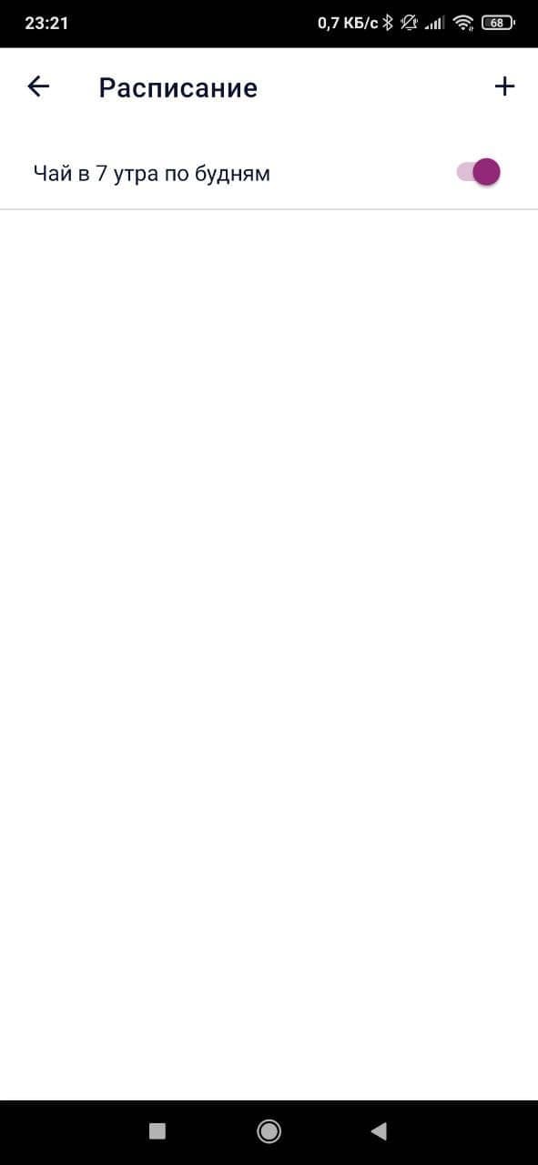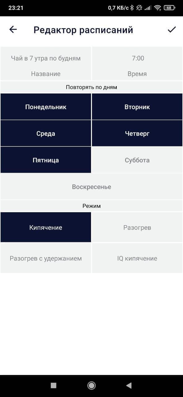 В режиме «расписание» можно задать время включения чайника (с точностью до минуты), температуру (30—100 °C, шаг — 5 °C) и режим нагрева. При этом допускается создания множества различных сценариев, благодаря чему можно гибко настроить множество режимов работы (например, отдельно для будних и рабочих дней).