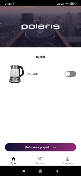 Теперь можно придумать имя устройству (мы прозаично назвали его «Чайник»), а также назвать помещение и комнату, где находится прибор. Мы указали только комнату — кухня. Сохраняем, и можно приступать к управлению PWK 1775CGLD. На домашней странице IQ Home появилось устройство и рядом бегунок, тапнув по которому вы включаете чайник в режиме кипячения. Чтобы перейти к другим функциям, жмем на изображение прибора.