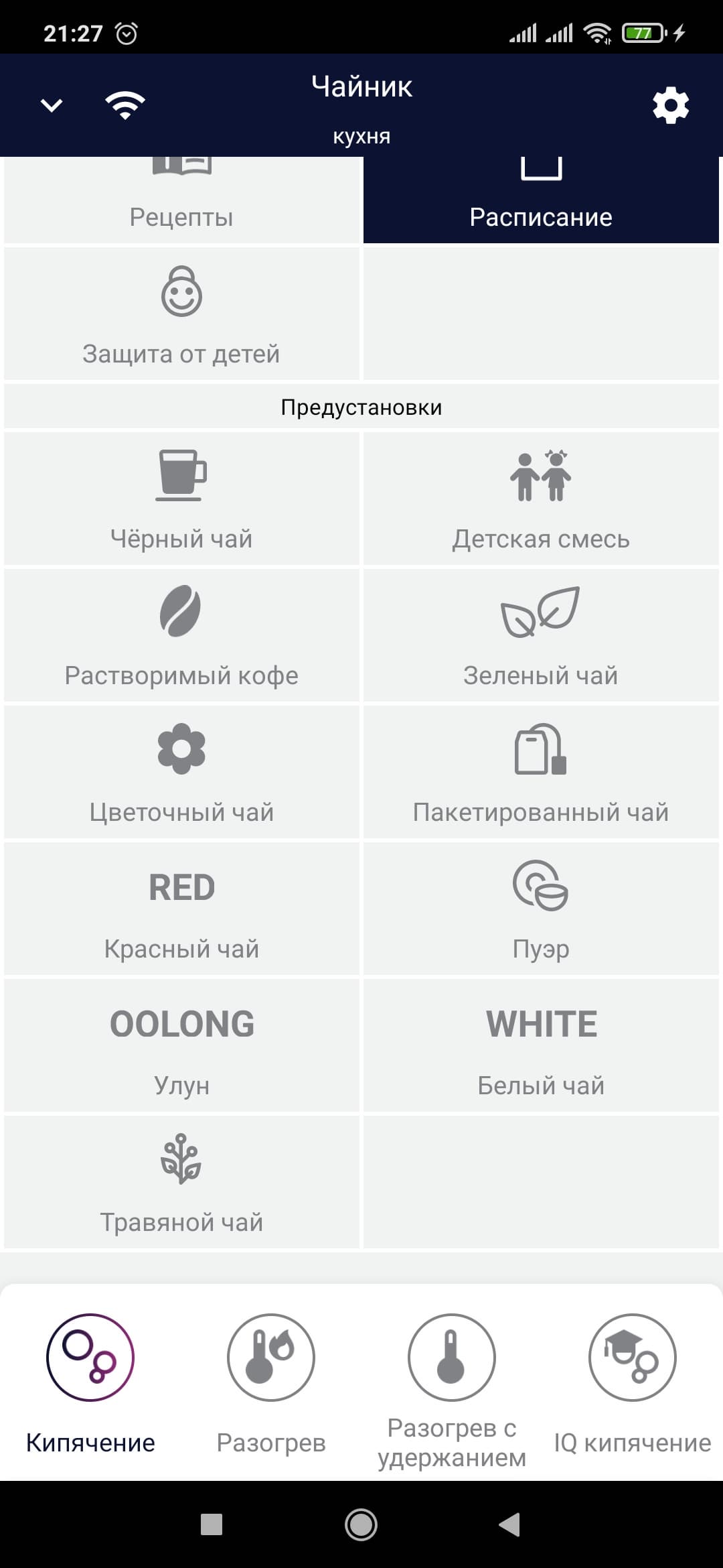 Предустановки позволяют вам автоматически подогреть воду до температуры, подходящей для выбранного напитка. Решили заварить зеленый чай — выбрали в меню соответствующий пункт, нажали на «Вкл.», и чайник разогрел воду до 80°. Надо развести детскую смесь — нашли в меню, получили воду 40°.