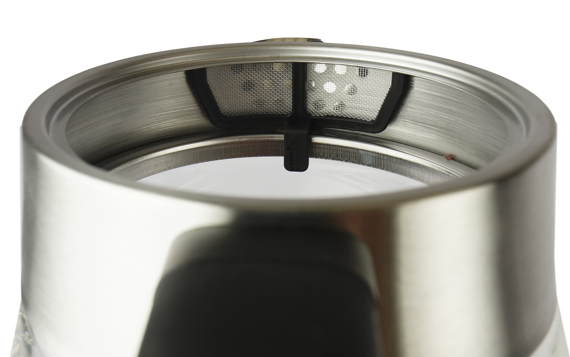 Внутри чайника, на месте крепления к нему носика, находятся отверстия для пролива воды, а также расположен съемный нейлоновый фильтр от накипи.
