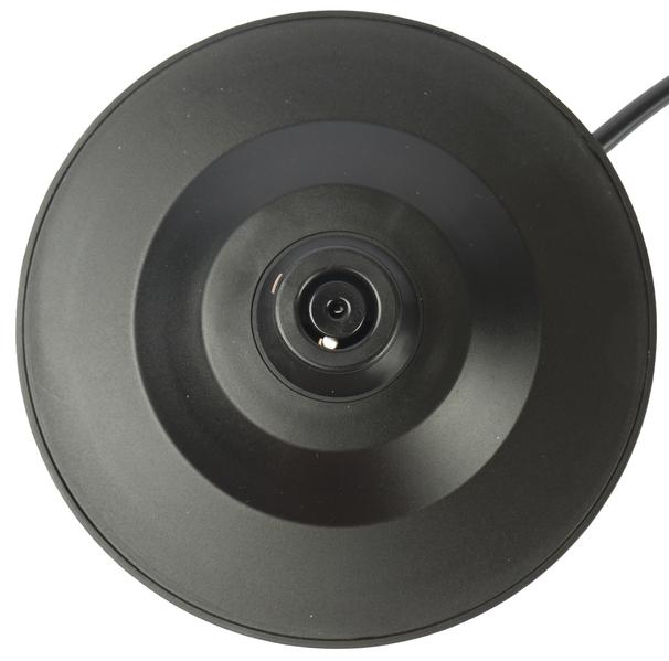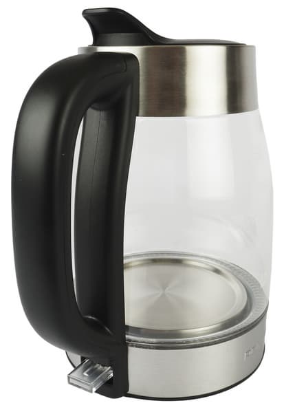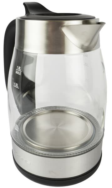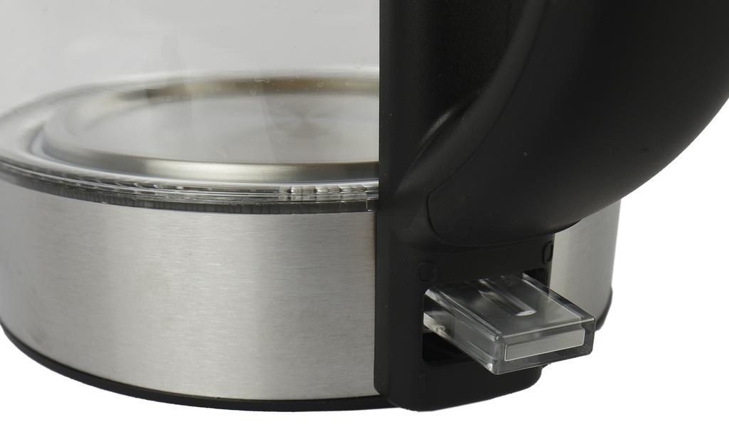 Прибор имеет черное пластиковое основание, черную ручку и такую же крышку. Между ними расположена стеклянная прозрачная колба с заявленным полезным объемом в 1,8 л, на дне которой по кругу расположены светодиоды, включающиеся при нагреве. Носик чайника и ободок, на котором он расположен, сделаны из нержавеющей стали и перекликаются с металлическим основанием и дном, которое видно сквозь колбу. Носик достаточно широкий, но плавно сужен к центру, поэтому выглядит аккуратно.