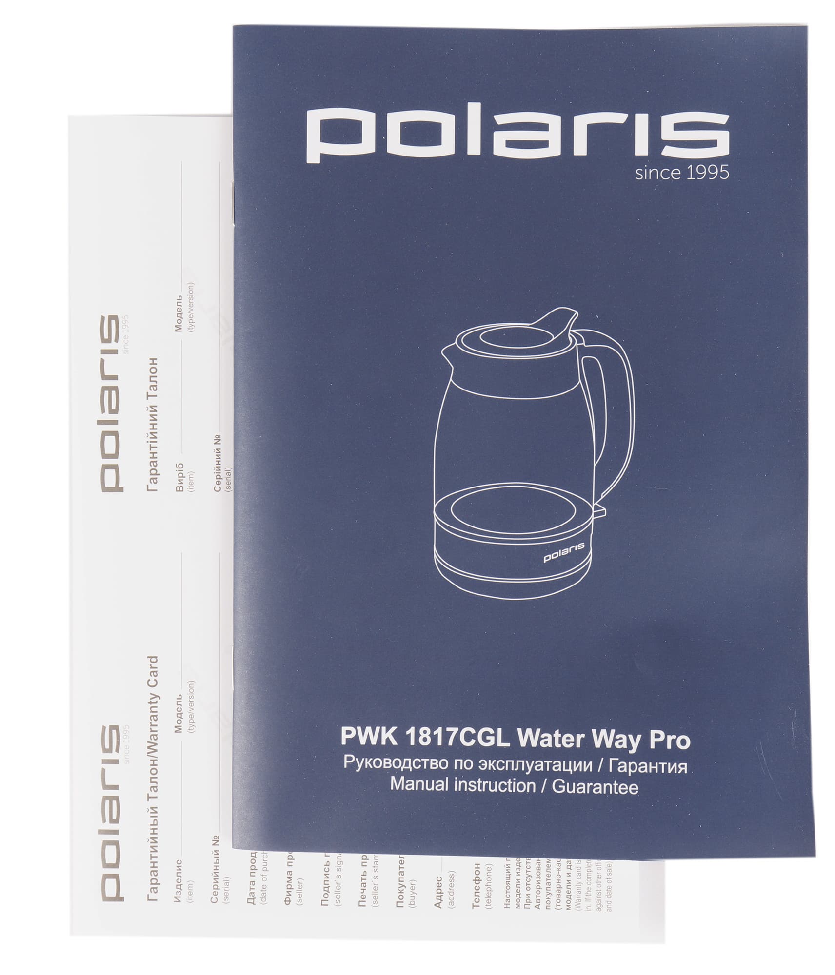 Наш сегодняшний гость — электрический чайник Polaris PWK 1817CGL. Этот прибор сложно назвать эксклюзивным ввиду его вполне типичного внешнего вида и полного отсутствия дополнительных функций, кроме основной и очевидной. Однако, как и все прочие последние модели данного бренда, этот чайник имеет изюминку — крышку, изготовленную по запатентованной технологии Polaris. Благодаря изобретению Water Way Pro можно заливать воду в чайник с надетой крышкой, просто подставив его под струю воды.