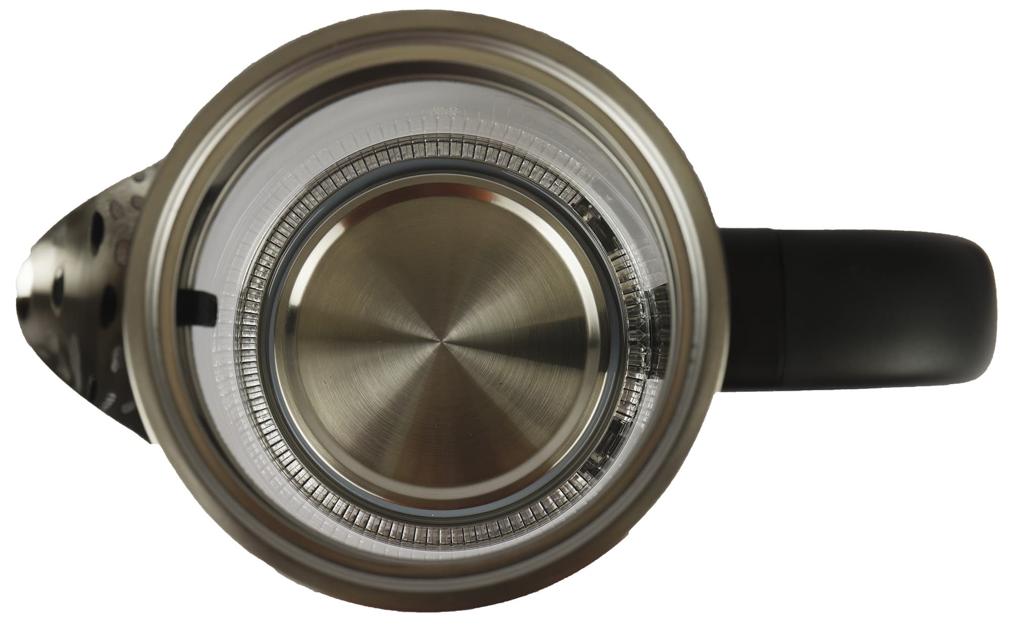 Взглянув на открытый чайник сверху, мы видим дно из нержавеющей стали, а по его периметру расположены около сотни светодиодов.