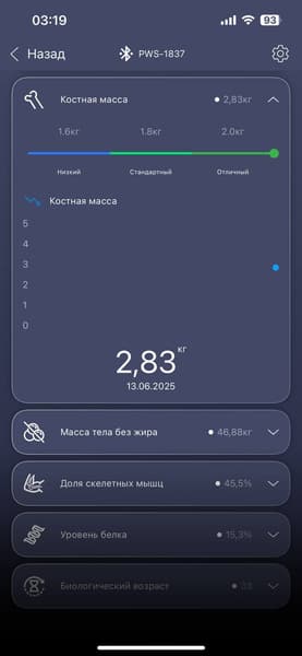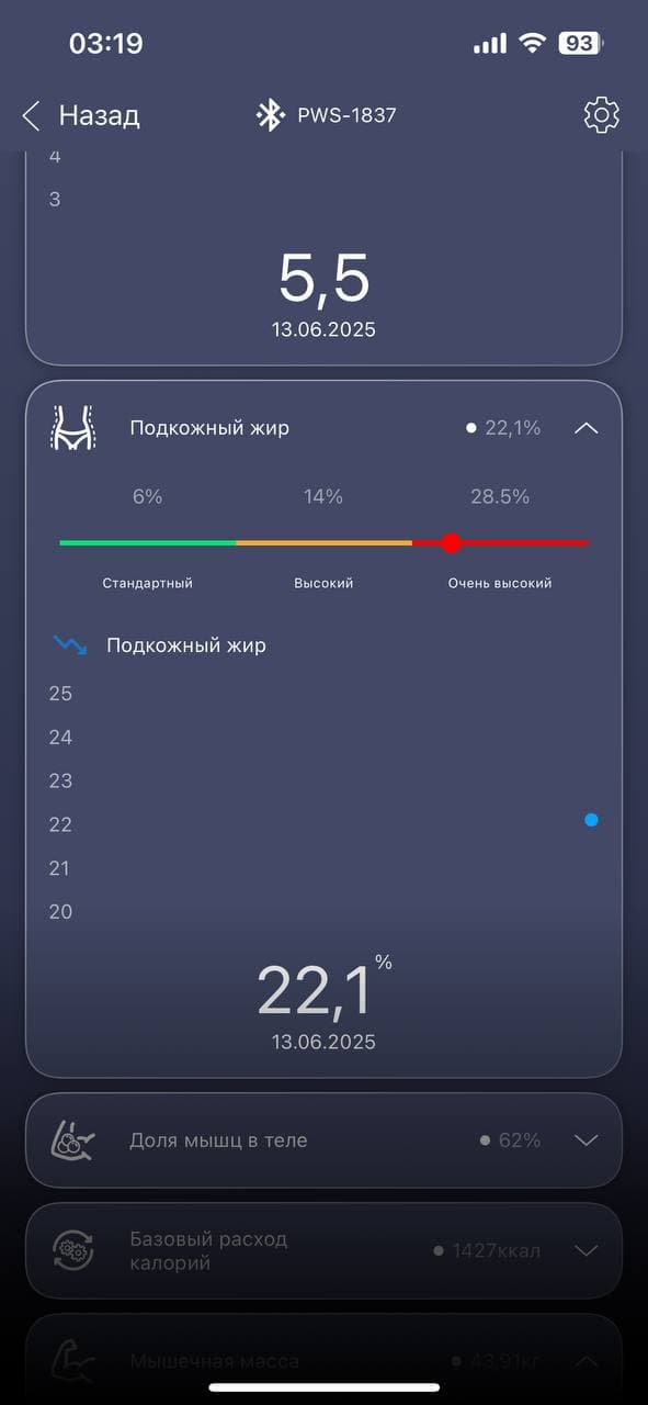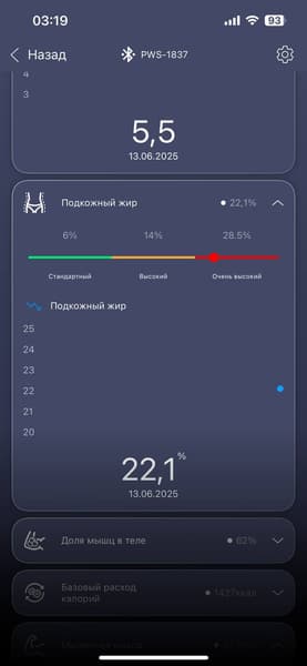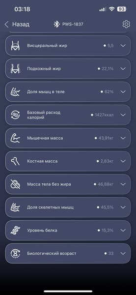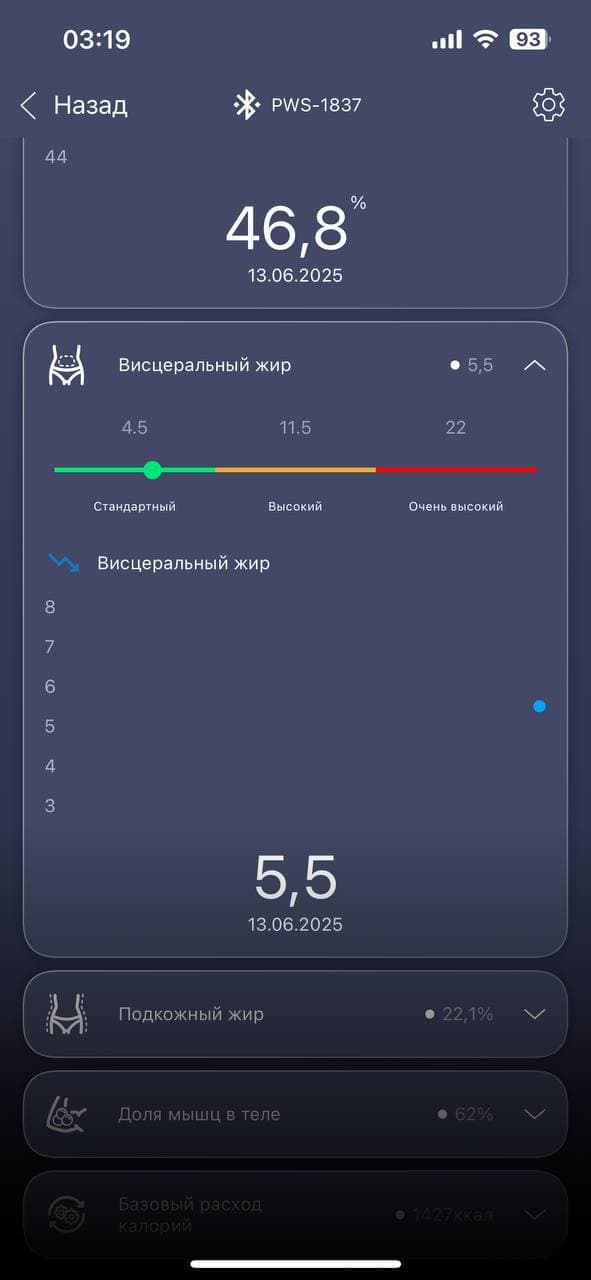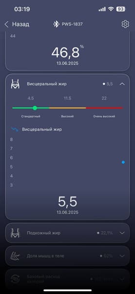 Раскрыв каждый из параметров мы получаем подробную картину о состоянии нашего тела и оценку каждого из значений. Оценки колеблются от «Низкий» до «Очень высокий».