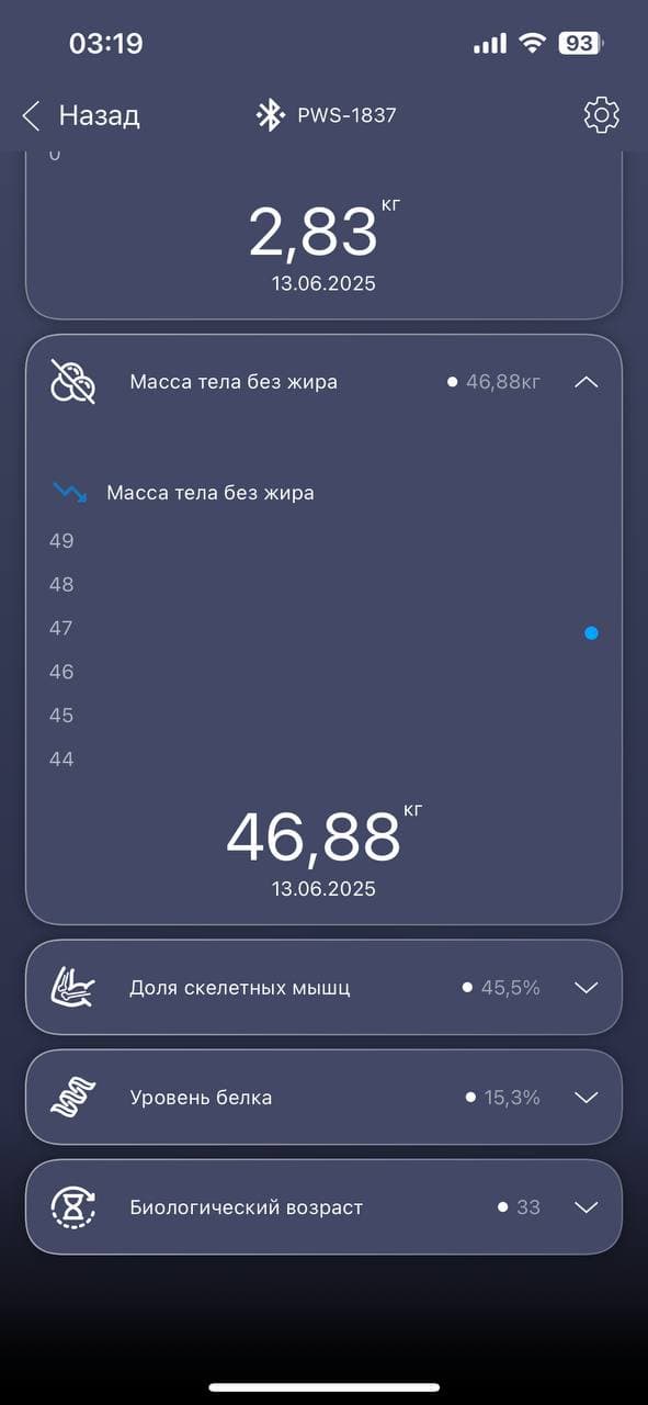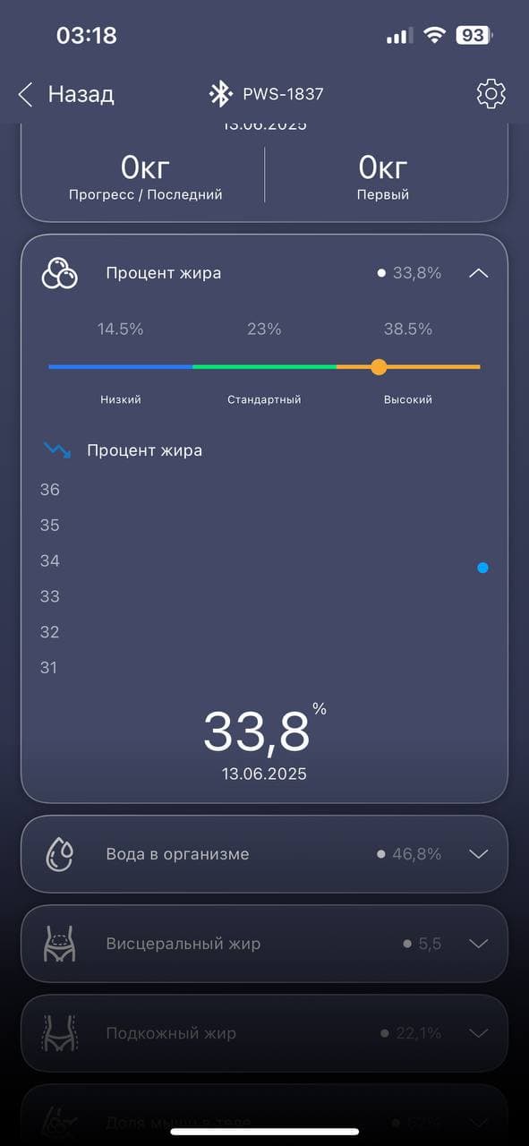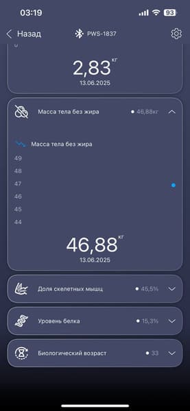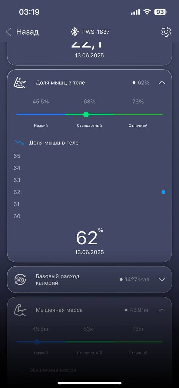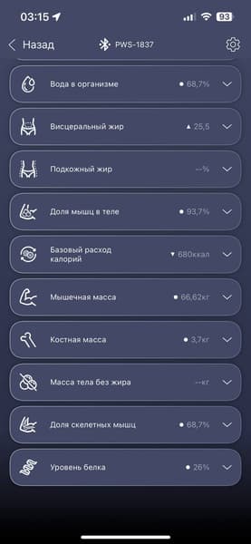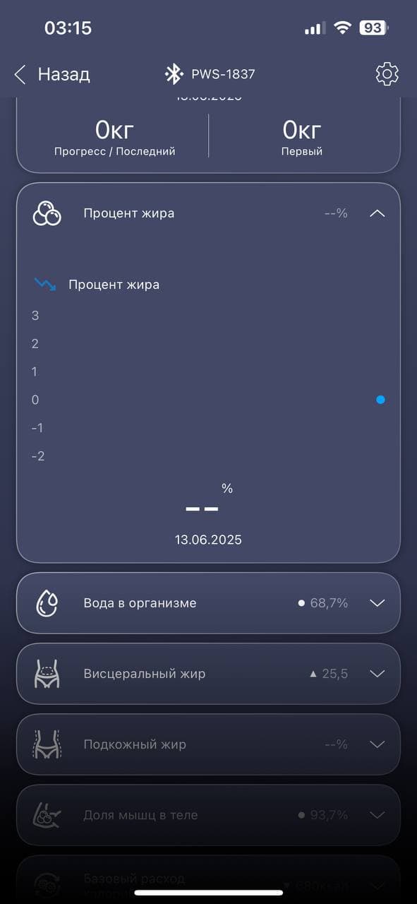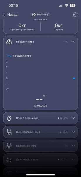 Мы видим такие показатели, как: вода в организме, висцеральный жир, доля мышц в теле, базовый расход калорий, мышечная масса, костная масса, доля скелетных мышц и уровень белка. В остальных графах видим прочерке и при раскрытии графиков наблюдаем пустые окна.