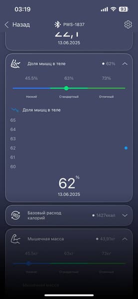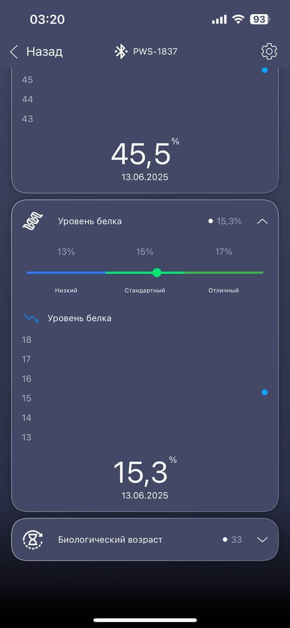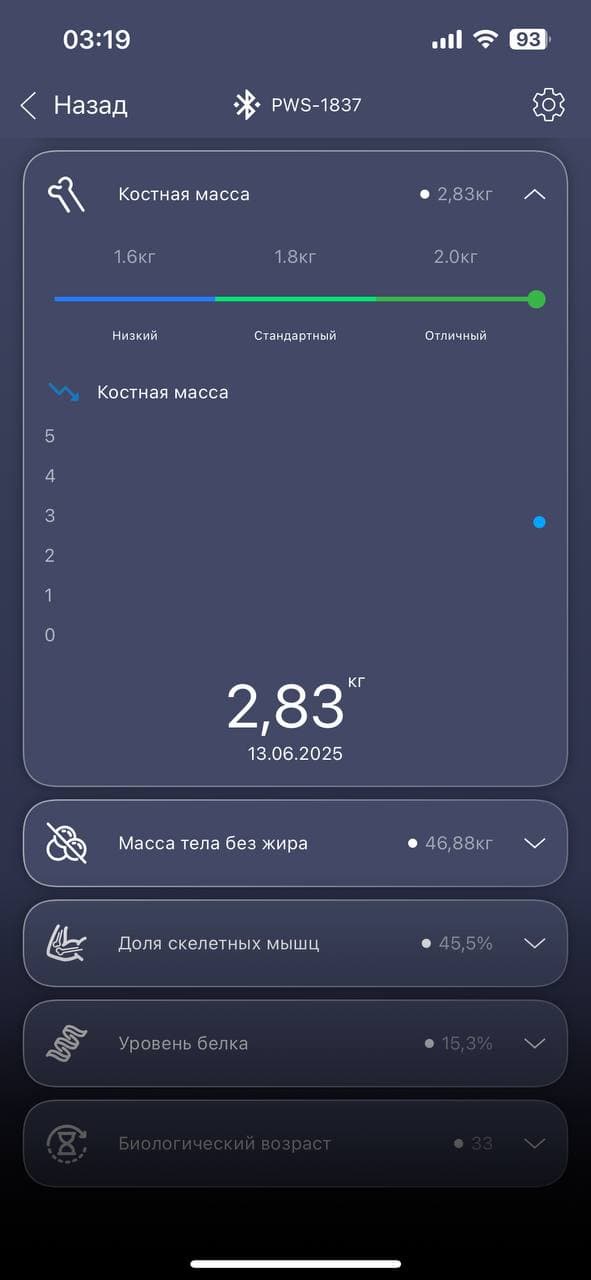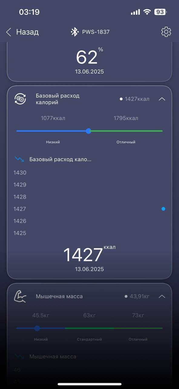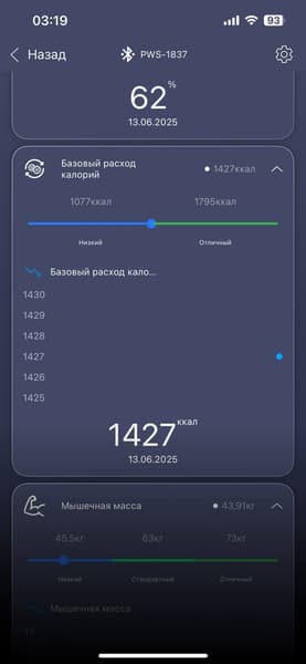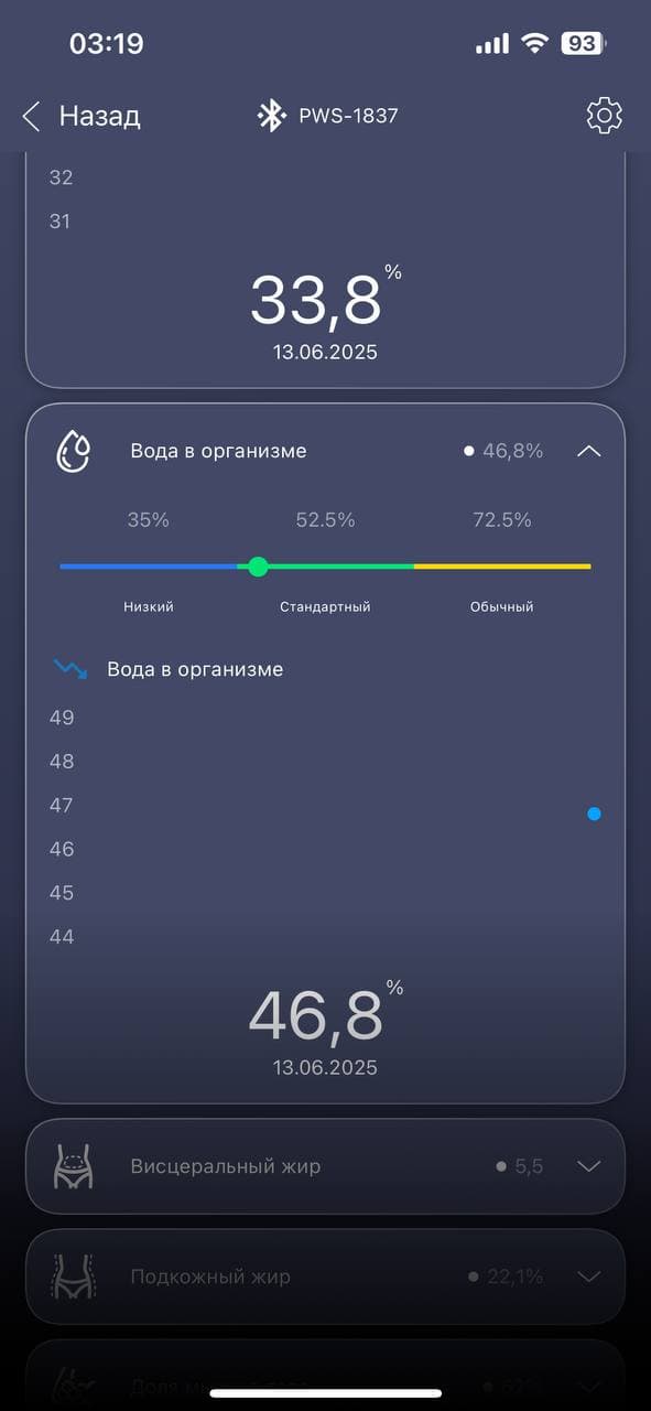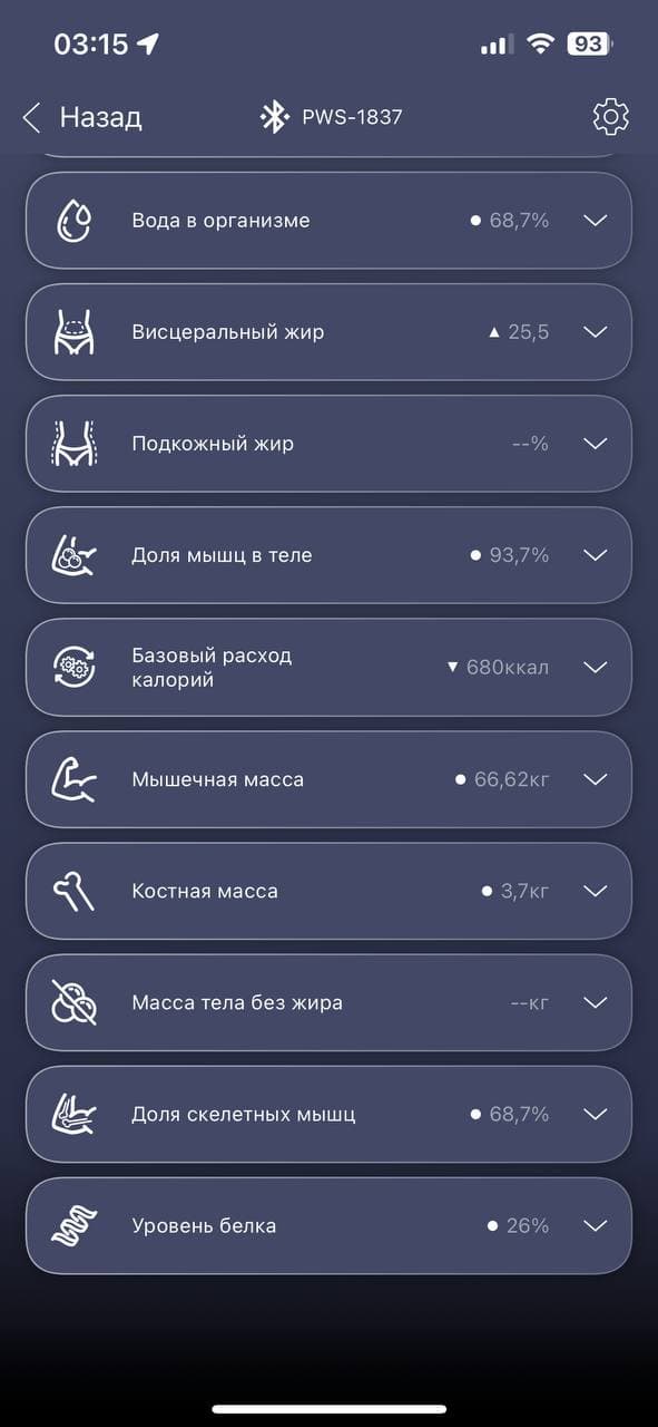 Мы видим такие показатели, как: вода в организме, висцеральный жир, доля мышц в теле, базовый расход калорий, мышечная масса, костная масса, доля скелетных мышц и уровень белка. В остальных графах видим прочерке и при раскрытии графиков наблюдаем пустые окна.