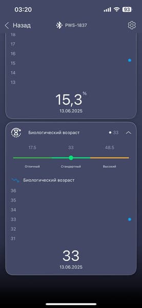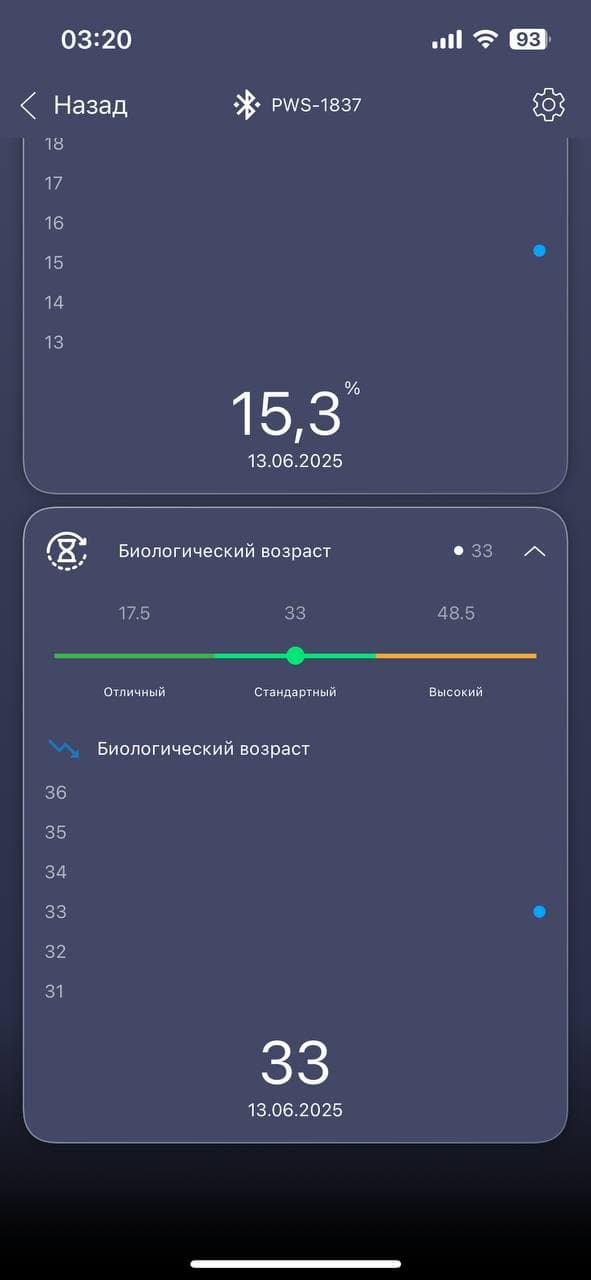 Как можно видеть, наш сотрудник в нормальной форме, но и есть над чем призадуматься и поработать. Например, приложение, высчитывает, что биологический возраст, исходя из полученных данных — 33 года, что на 2 года больше, чем на самом деле.