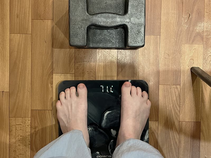 Итак, мы взвесились. Без регистрации, смс и носков, но с телефоном в руках. Телефон мы взяли, чтобы сделать фото веса, отображаемого на физических весах. Как можно видеть числа в приложении и на весах идентичны.