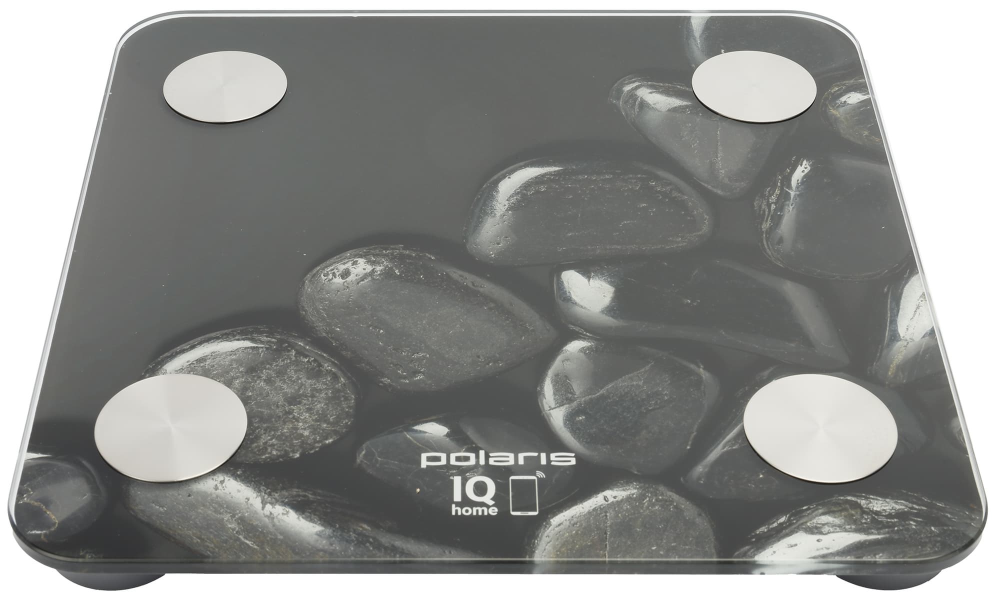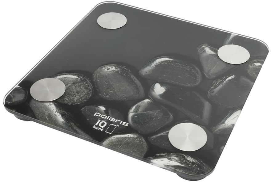 Скругленная по углам панель весов 28×28 см сделана из многослойного стекла и имеет четыре металлических диагностических контакта. Под стеклом располагается субъективно приятная или, как минимум, не раздражающая взор картинка с мокрыми камнями.