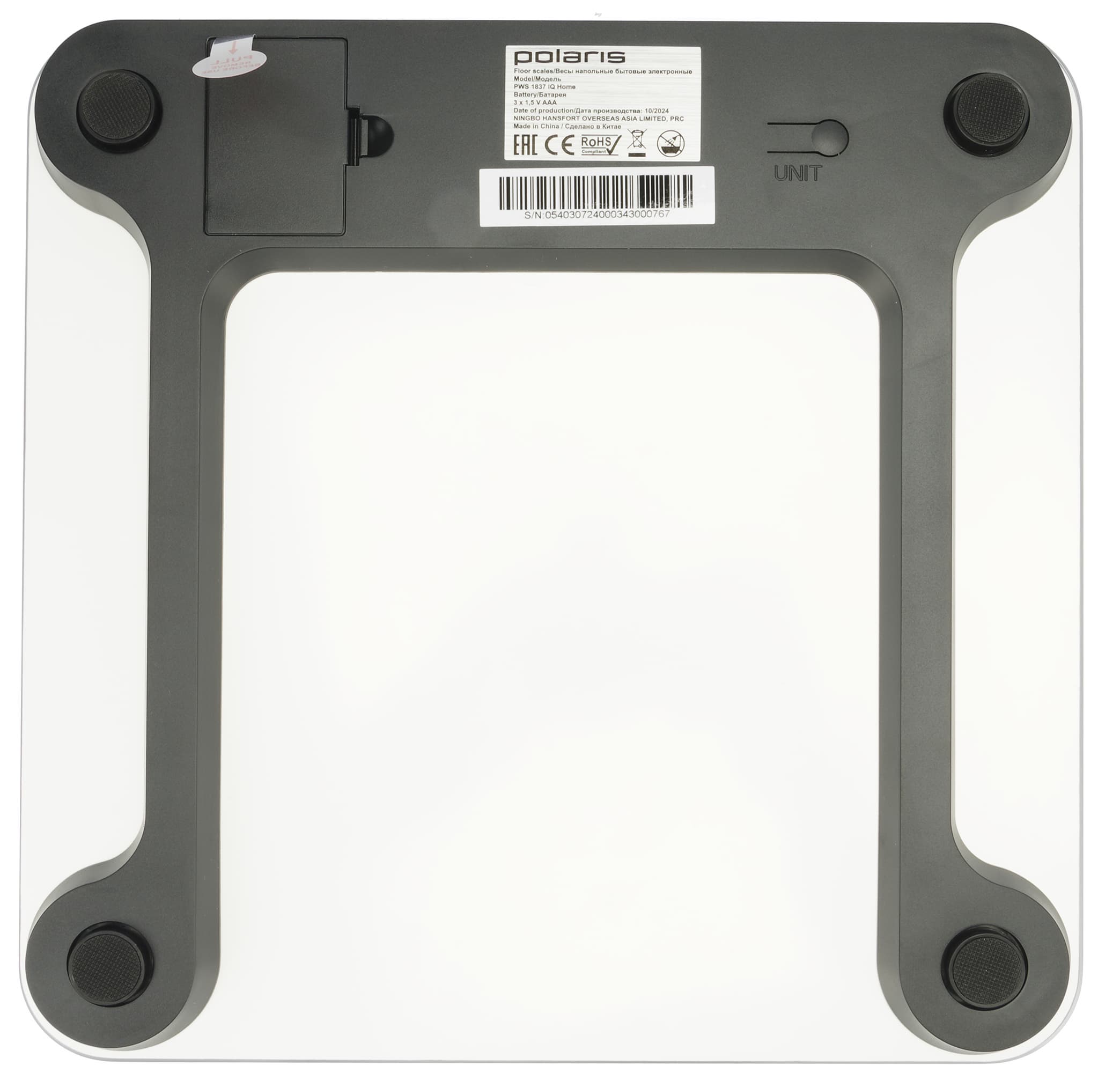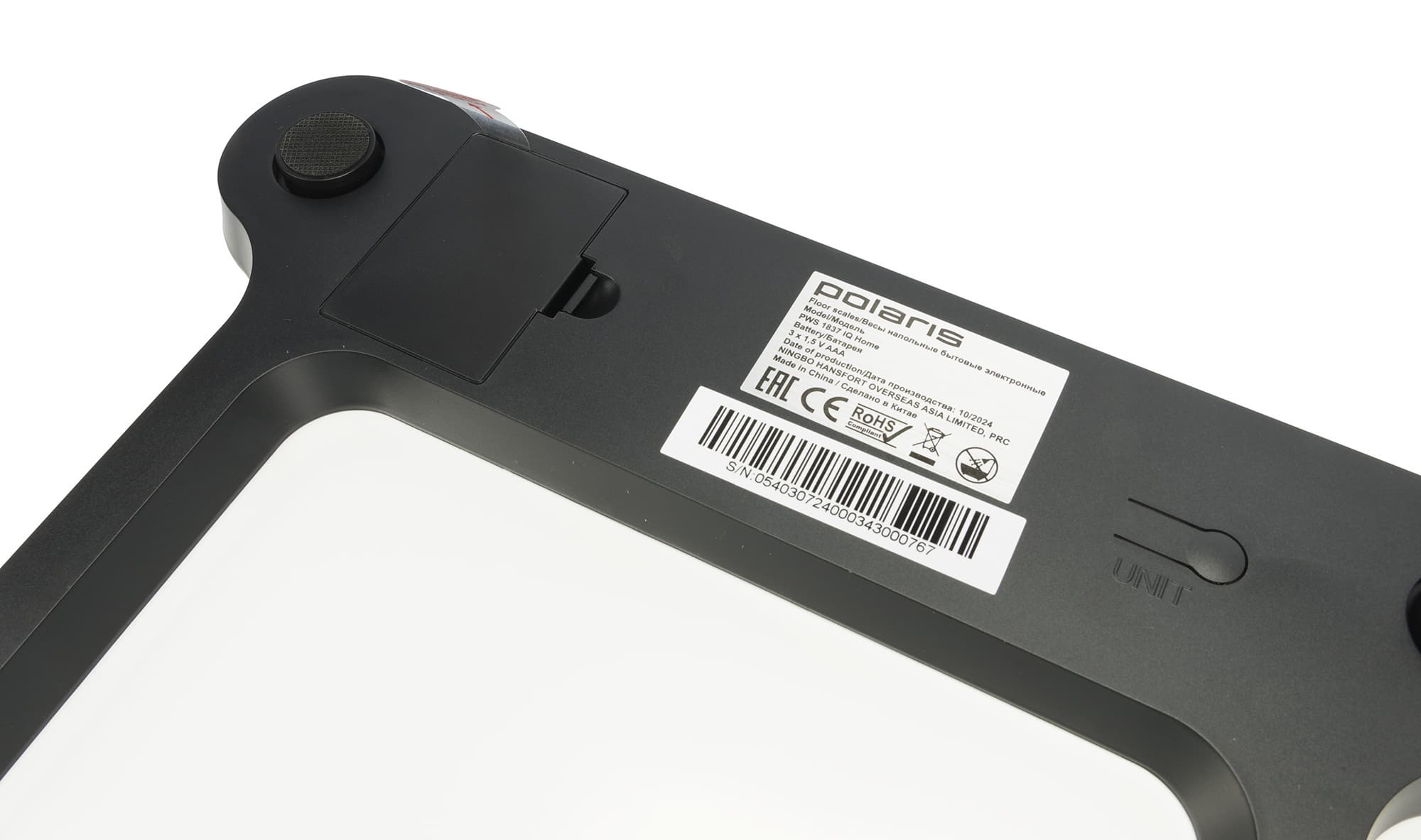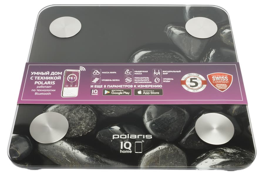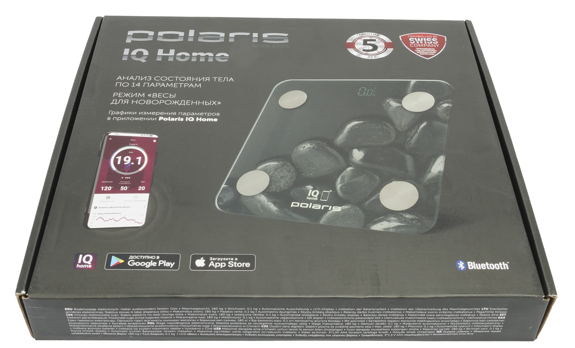 Весы поставляются в коробке, оформленной в фирменной стилистике Polaris: черный матовый фон, несколько красных элементов оформления, полноцветные фотографии прибора и интерфейса приложения.
