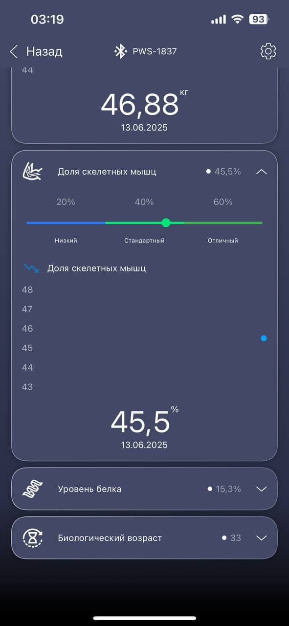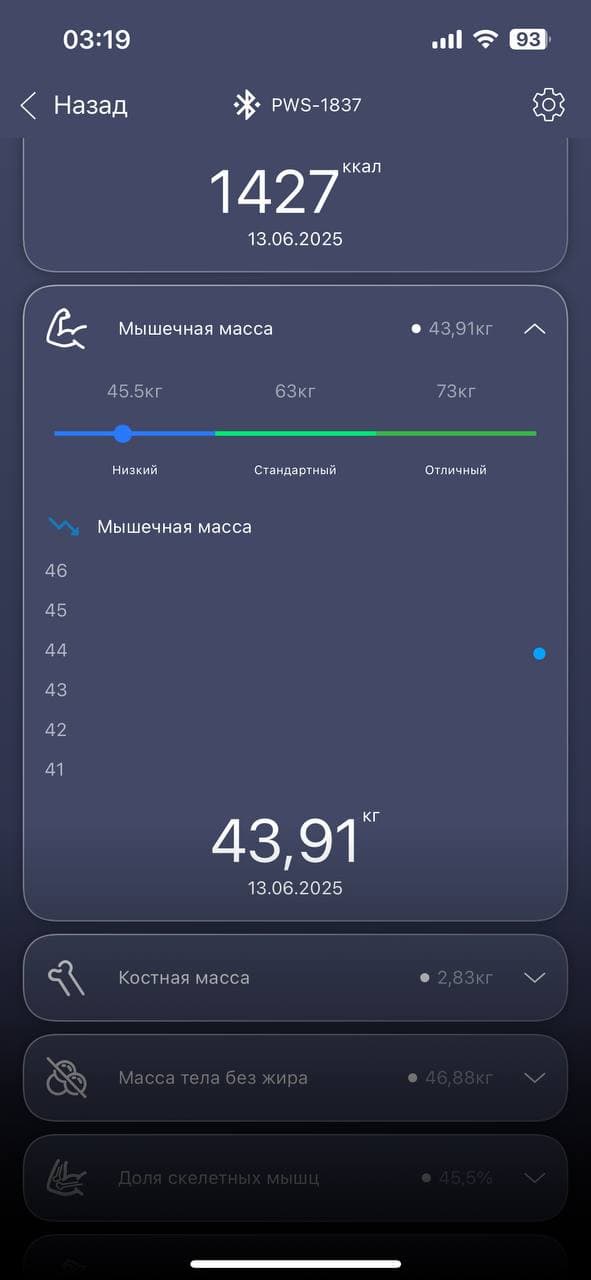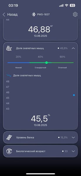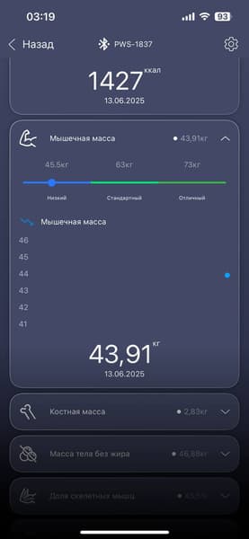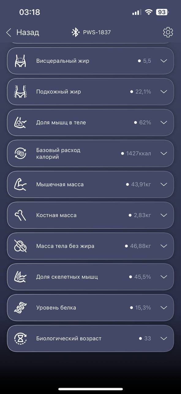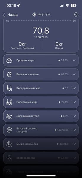 Хотелось бы сказать, что это уже что-то, но даже не будучи специалистами в области состава тела, мы видим, что некоторые значения объективно некорректны. При весе 71 кг иметь 66,6 кг мышц — весьма сомнительно.