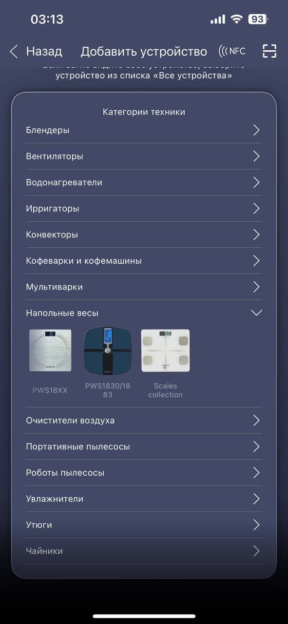 Единственная сложность может быть в том, что в разделе «Напольные весы» сразу не видно данной модели и суметь догадаться, что весы Scales Collection — это еще одна папка с приборами данной серии. Поэтому мы воспользовались поиском прибора именно при помощи сканирования QR-кода, тогда приложение дало подсказку и направило нас в нужную папку с весами, где мы и указали нужные нам.