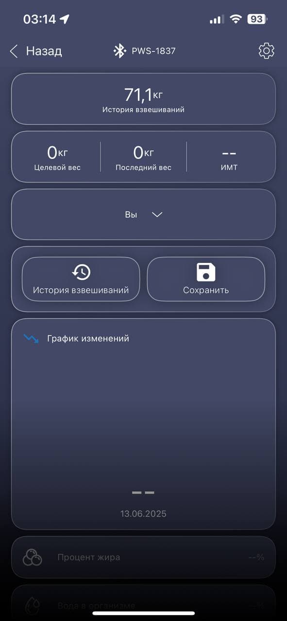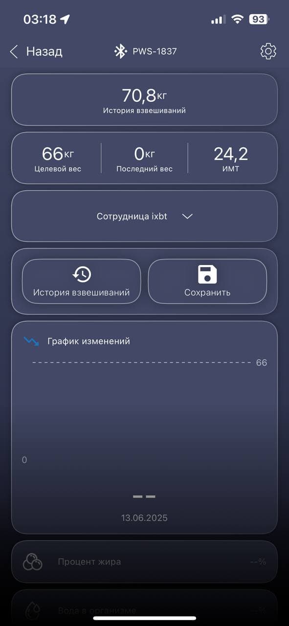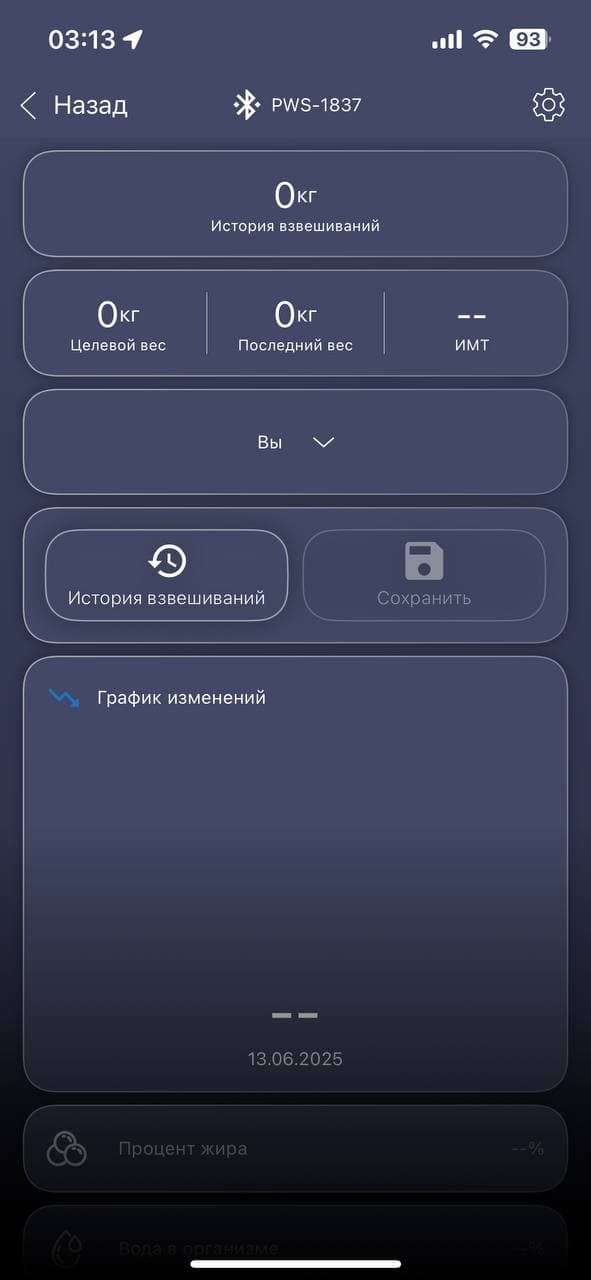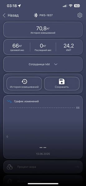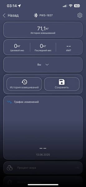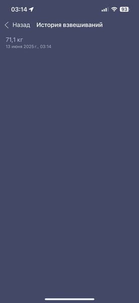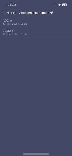 Ниже можно посмотреть историю взвешиваний конкретного пользователя и сохранить туда результат текущего взвешивания. Без сохранения информация сама не запишется.