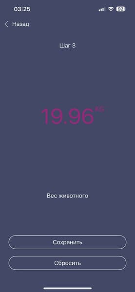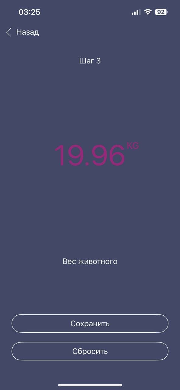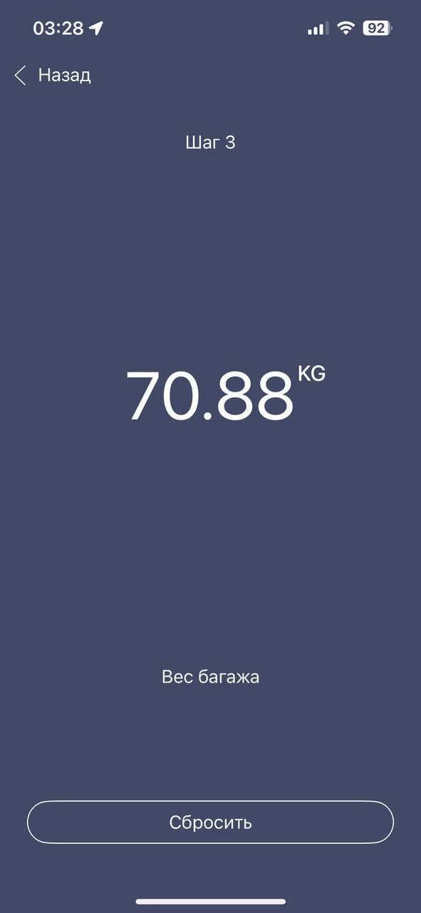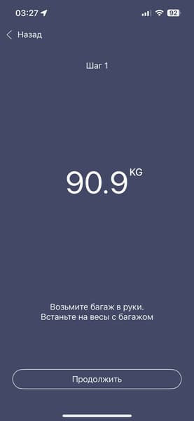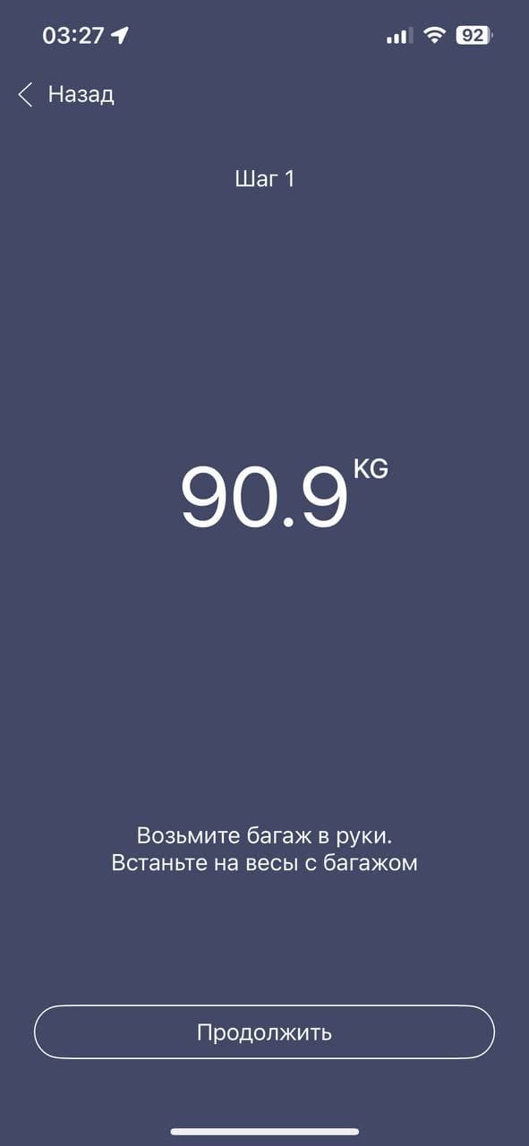 И вот тут что-то пошло не так. Схема измерений все та же, а результат мы видим в виде веса пользователя, хотя приложение уверяет, что это вес багажа и почему-то не выделяет его розовым, как это было с ребенком и животным. И сохранить это измерение мы тоже отчего-то не можем.