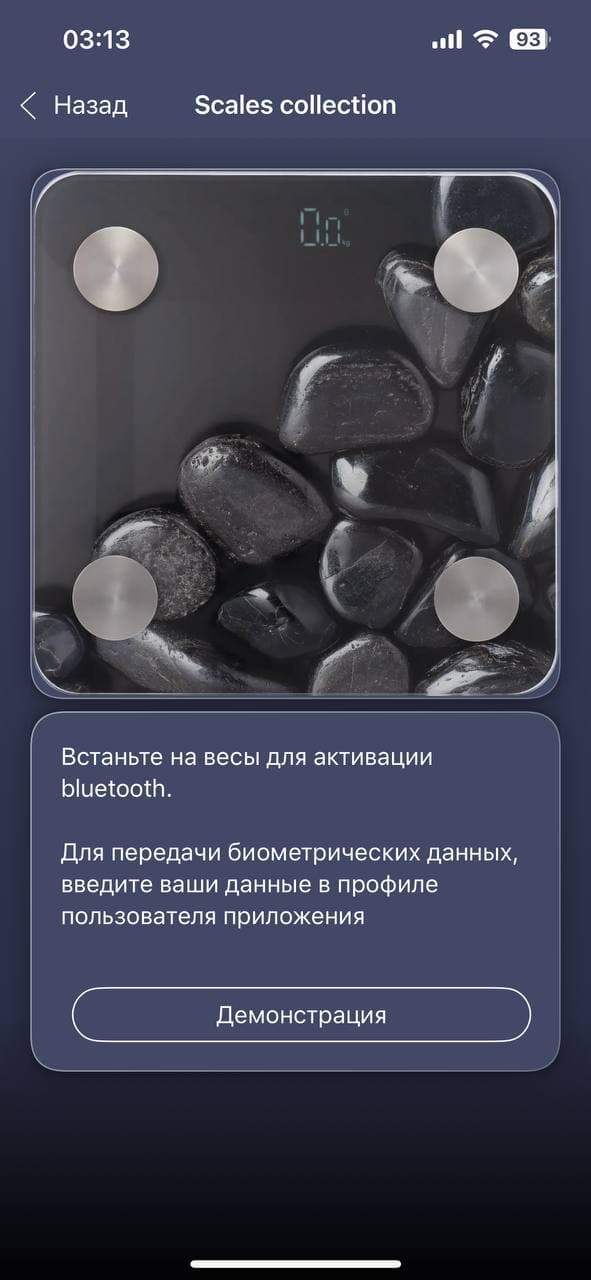 Для начала активируем весы и встроенный в них Bluetooth, встав на них или просто хорошенько надавив рукой, затем 4 раза нажимаем на кнопку с оборотной стороны устройства и получаем код 1234 на дисплее, который нужно ввести в приложении, чтобы завершить привязку. Вот и все, теперь можно изучать интерфейс.