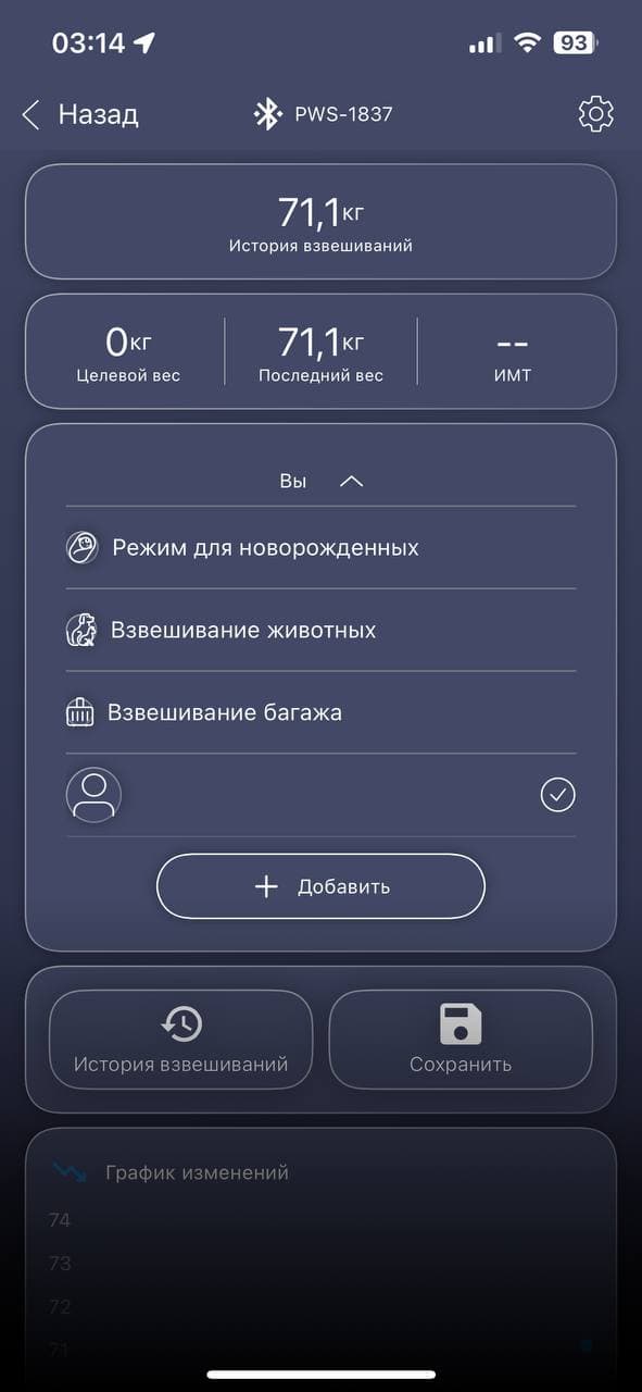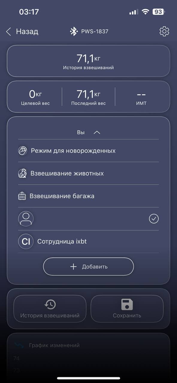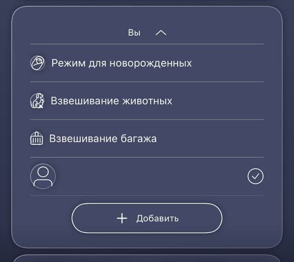 Под ним находится меню выбора и создания пользователя. Там же прячутся режимы измерений новорожденных, питомцев и багажа.