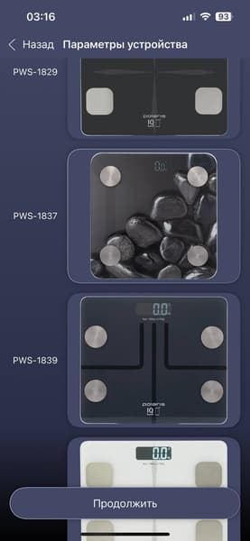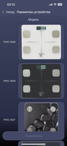 Нажав на раздел «Параметры устройства» мы попадаем на страницу с изображениями весов из серии Scales Collection. Картинки тут не кликабельны, а кнопка «Продолжить» возвращает нас на предыдущую страницу меню настроек. Видимо под параметрами устройства подразумевается, что мы можем просто посмотреть его внешний вид.