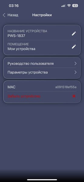 Можно поменять наименование устройства, помещения, почитать руководство по эксплуатации, посмотреть некие параметры, увидеть MAC-адрес и отвязать прибор от приложения.