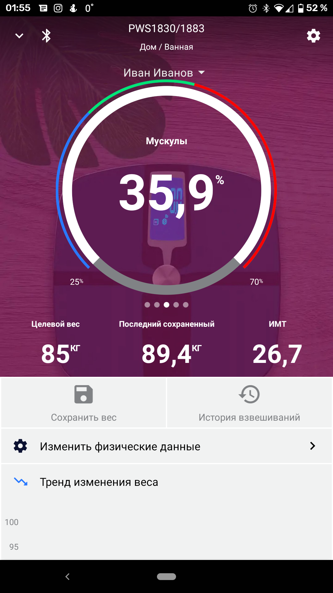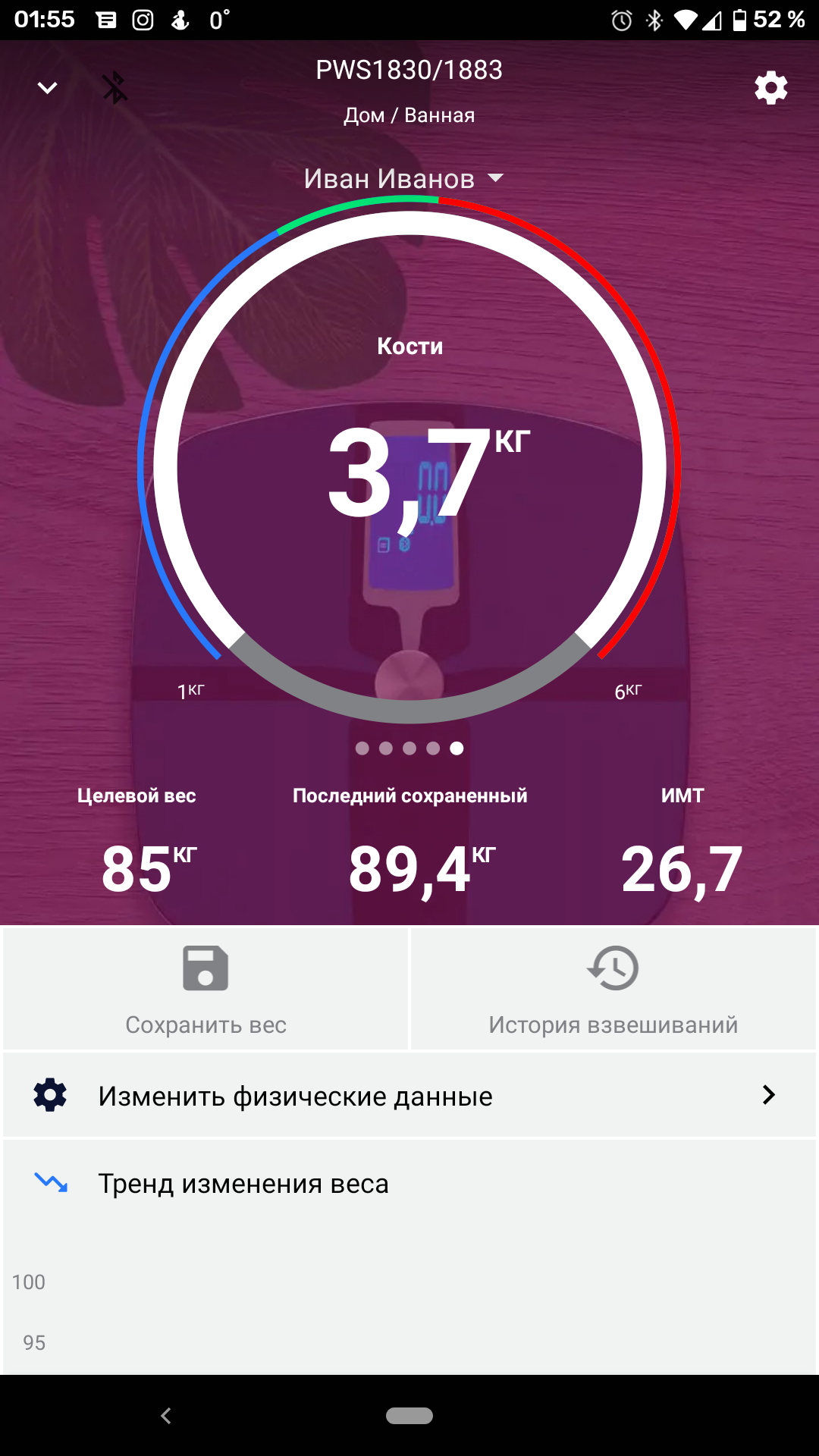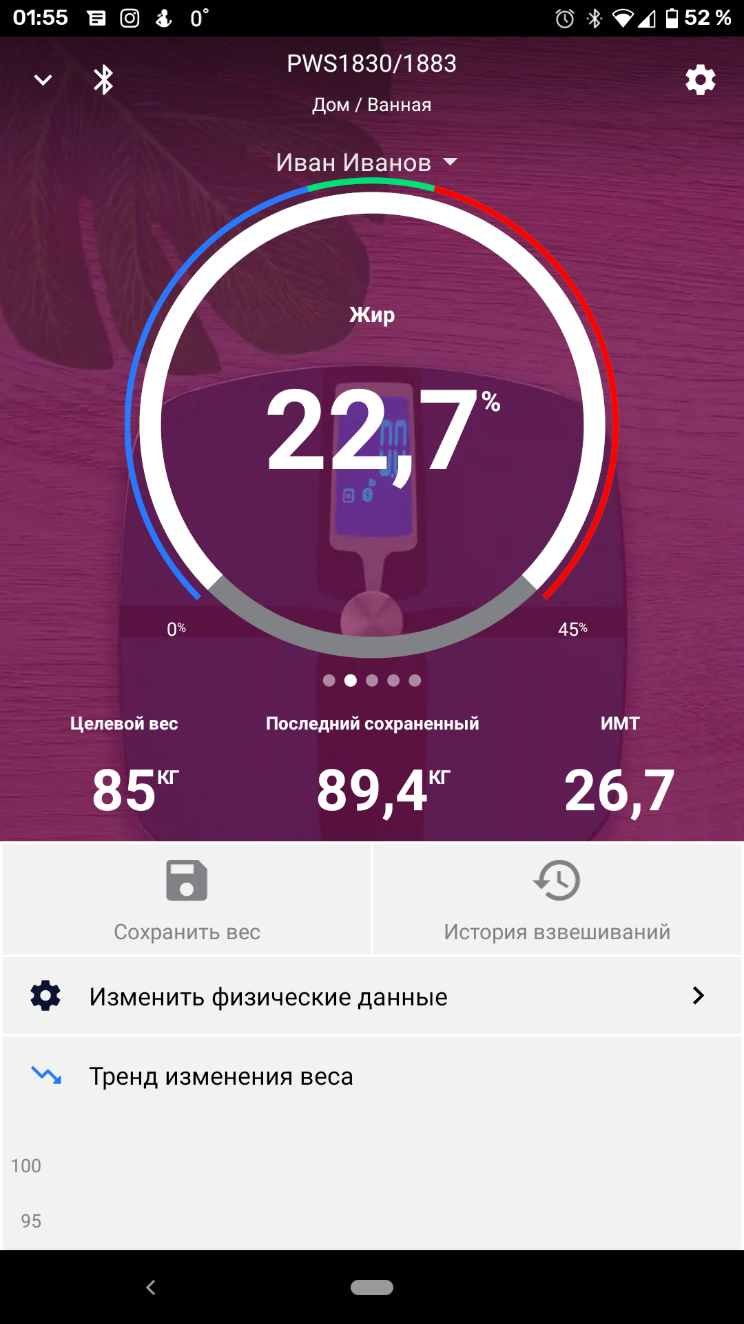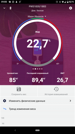 Чуть ниже расположен график, позволяющий контролировать изменения веса. Результаты измерений остальных параметров в приложении, похоже, никак не сохраняются: кривые их колебаний в истории взвешиваний недоступны.