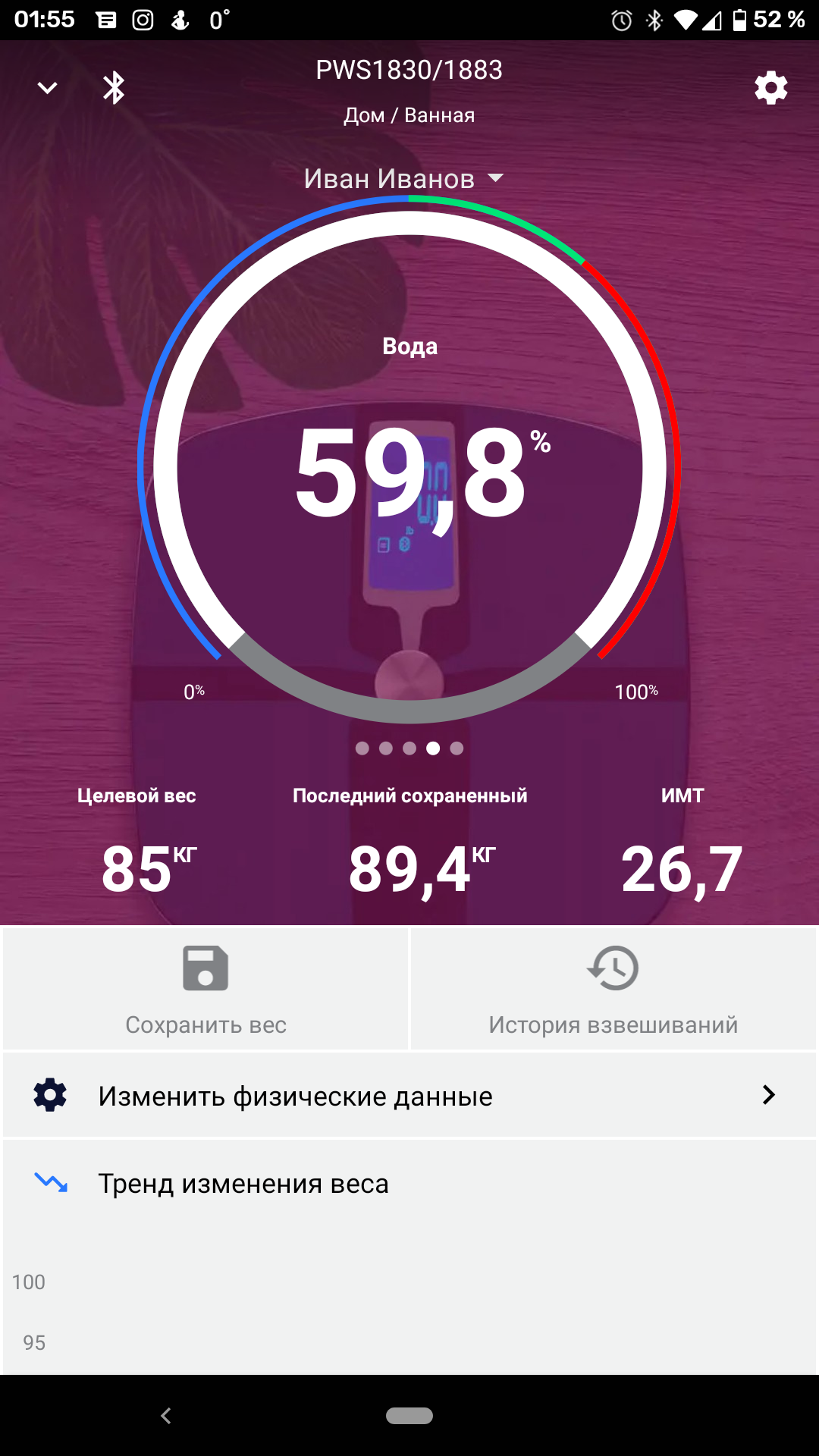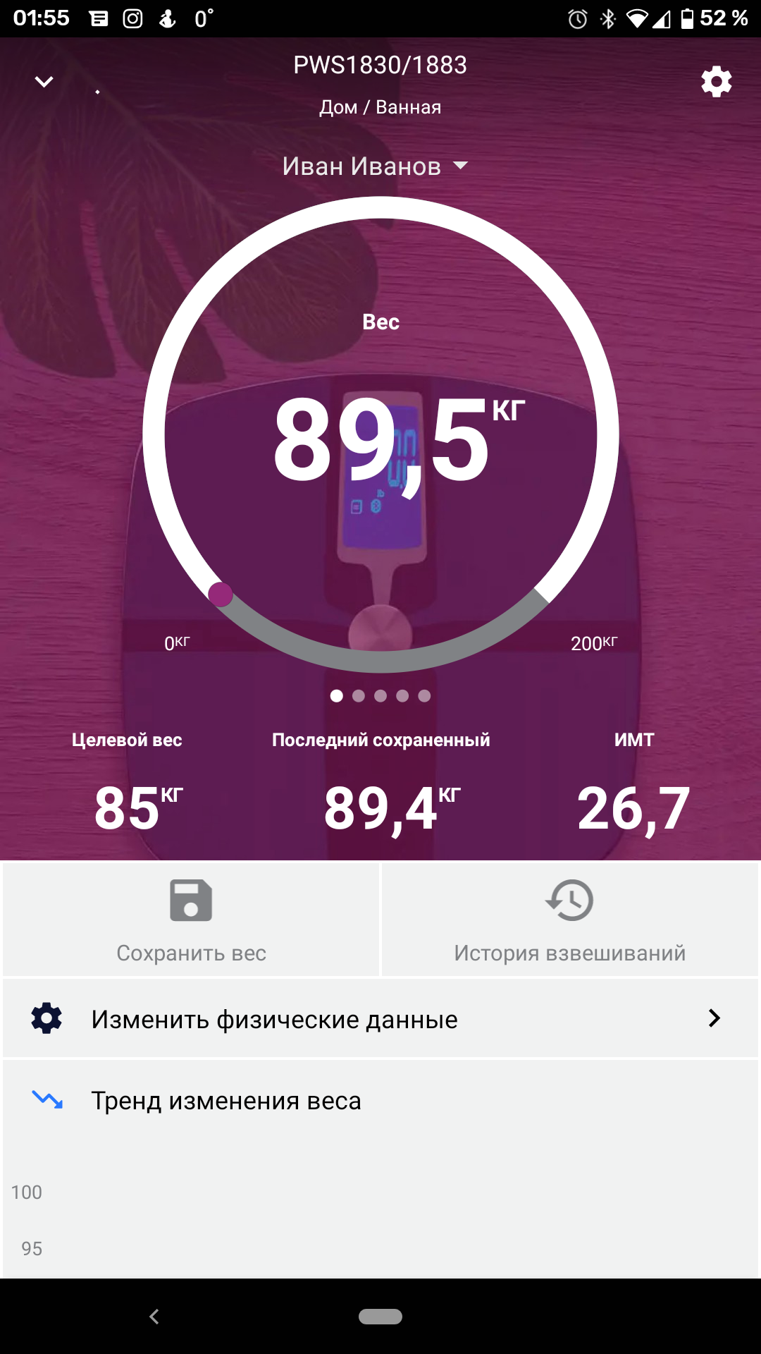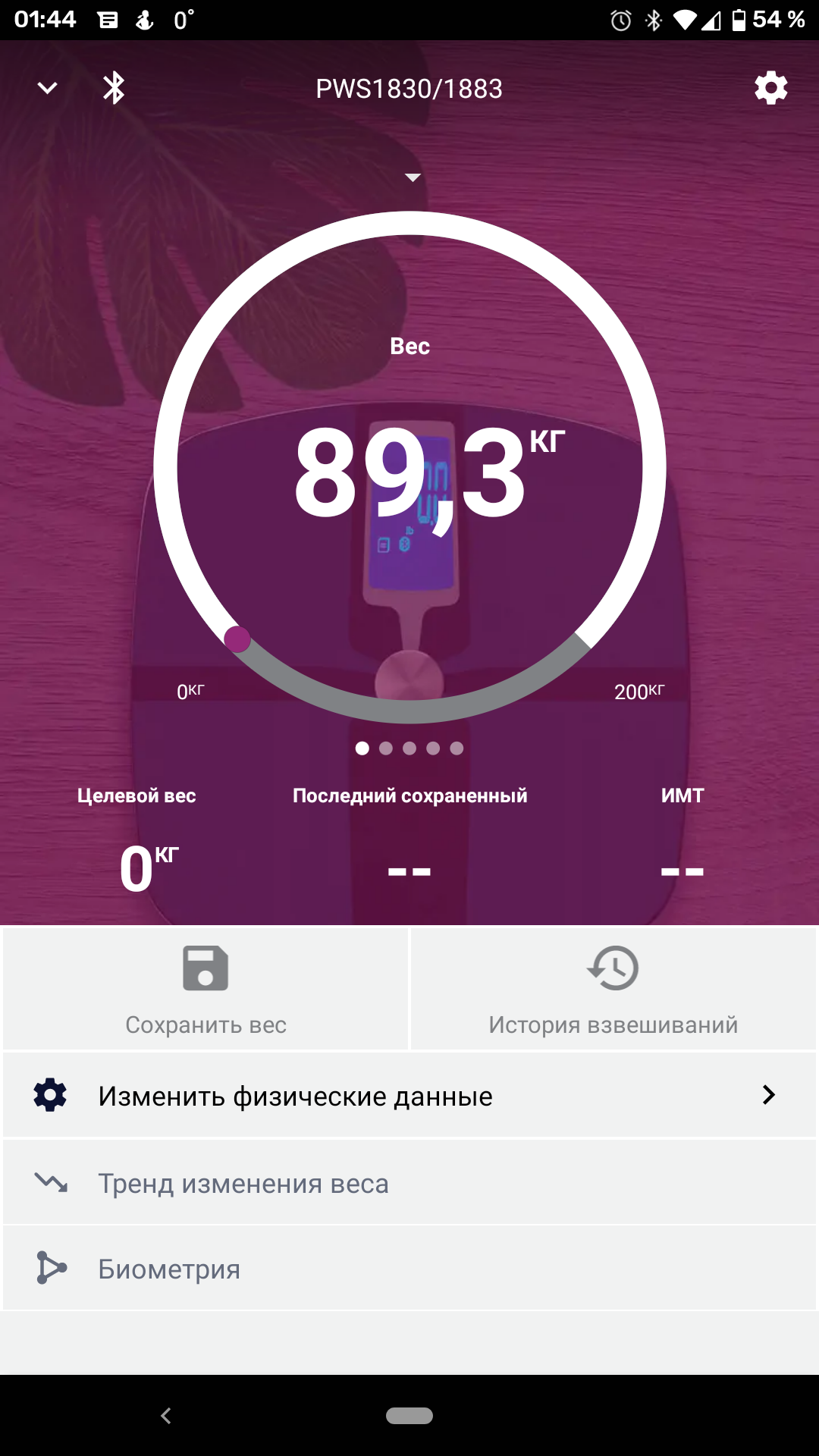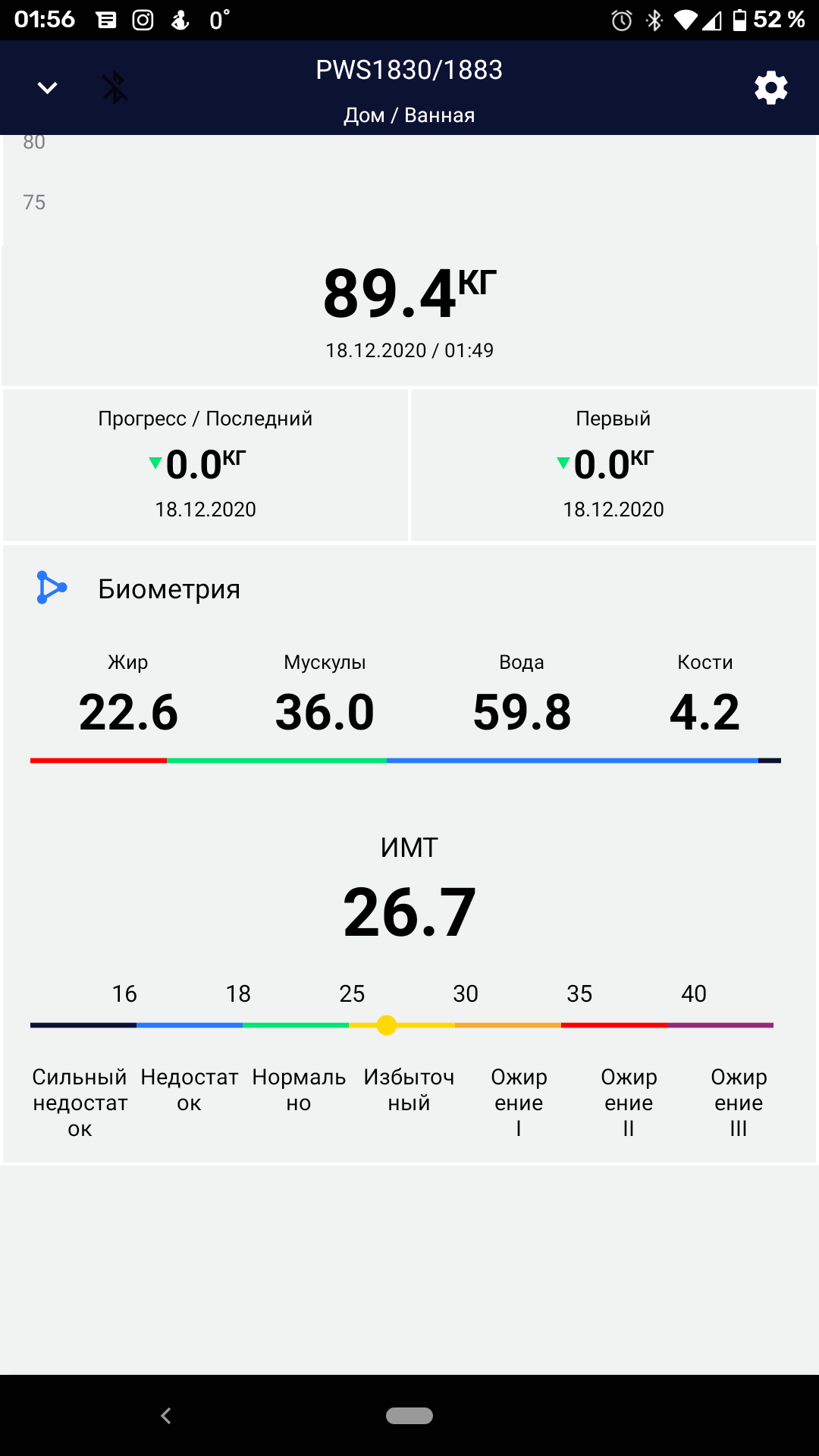 Чуть ниже расположен график, позволяющий контролировать изменения веса. Результаты измерений остальных параметров в приложении, похоже, никак не сохраняются: кривые их колебаний в истории взвешиваний недоступны.