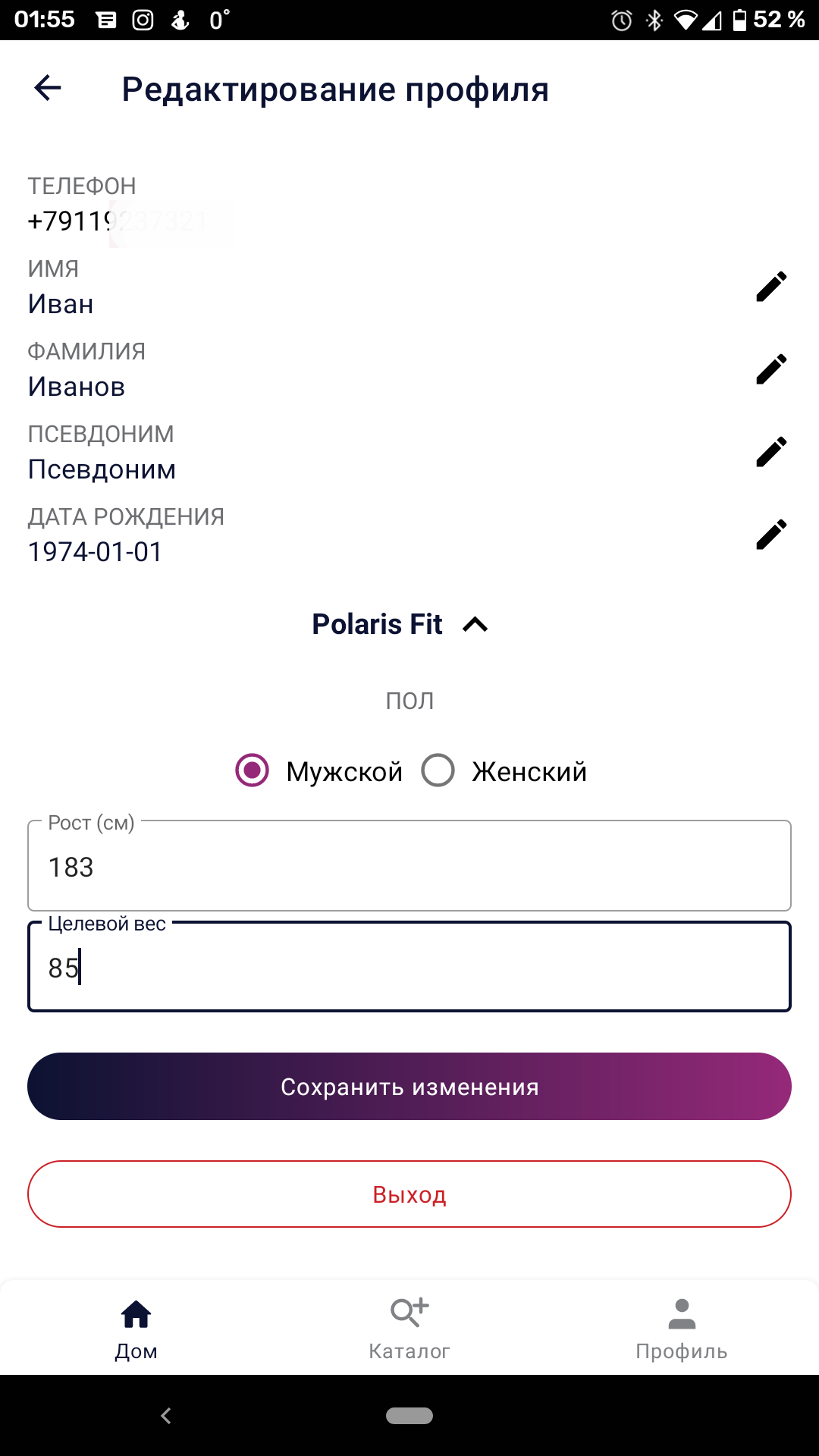 После выбора пола, роста и целевого веса можно сохранить изменения и начать работу.