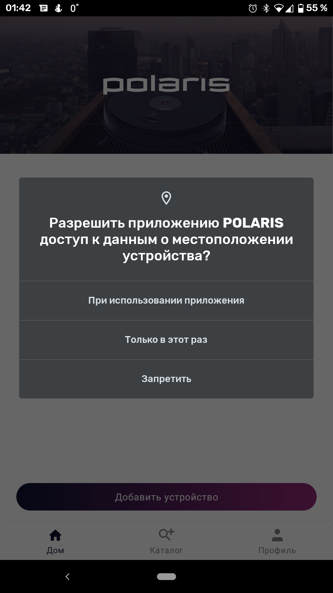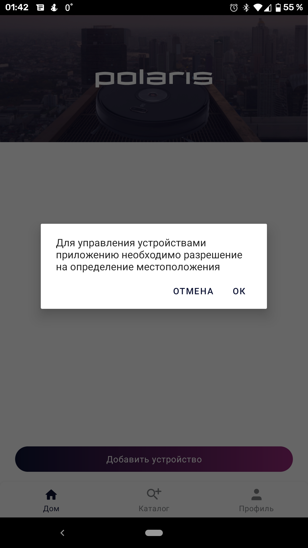 После установки приложение запрашивает доступ к местоположению, после чего позволяет добавить новое устройство.