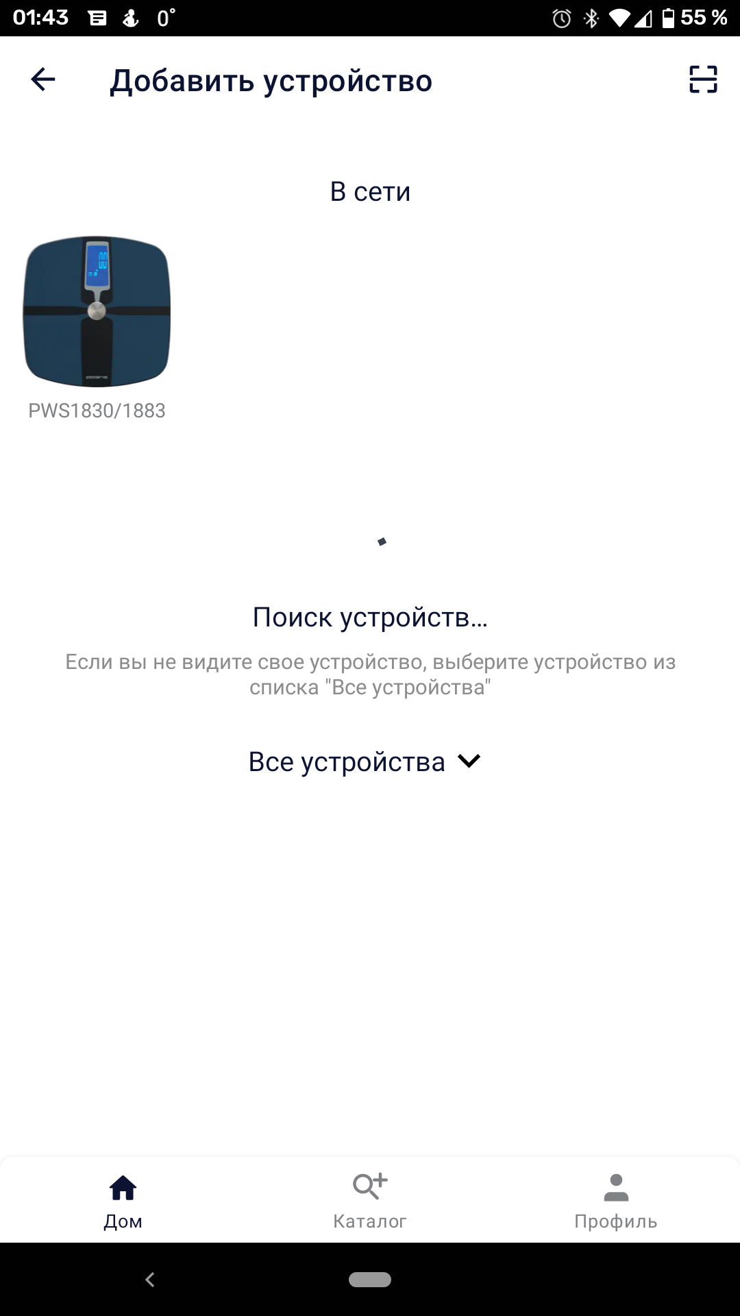 Процедура синхронизации с мобильным телефоном проста. Приложение обнаруживает прибор и предлагает жать на кнопку управления на нижней панели весов до тех пор, пока на их экране не появятся два вращающихся кружка, сообщающие о начале сопряжения. Несколько секунд — и устройством можно пользоваться.