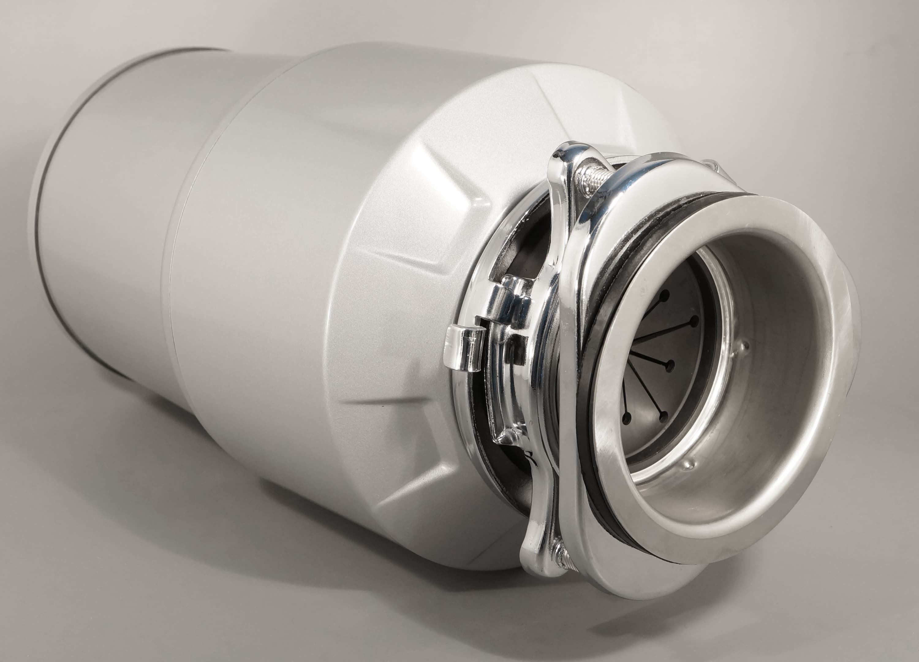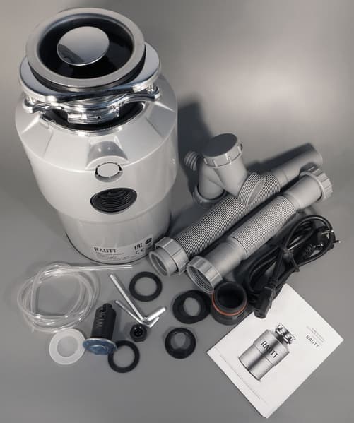 Внешняя оболочка измельчителя выглядит металлической, но это не так. Это пластик, покрашенный под металл. Хотя пластик, судя по всему, довольно прочный. А вот система креплений — металл. В верхней части располагается горловина, которой устройство присоединяется к кухонной мойке, заменяя сифон раковины. Пищевые отходы поступают через нее в рабочую камеру, где измельчаются на мелкие фракции, которые отводятся в канализацию через сливной патрубок сбоку. Электродвигатель, приводящий в движение ротор измельчителя, размещен в нижней части корпуса.