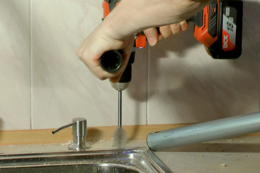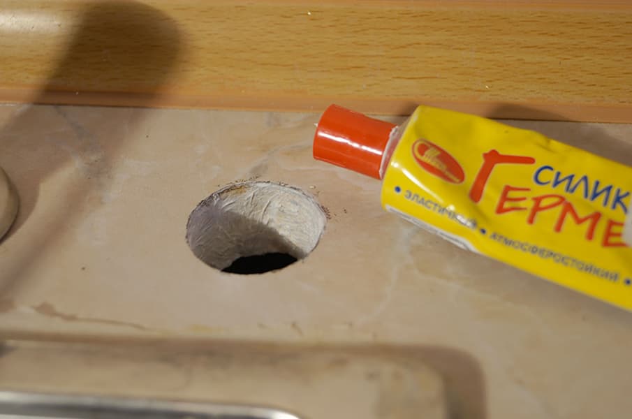 Процесс монтажа состоит из очевидных этапов. Вначале сверлим отверстие 30-миллиметровым пером (если речь о столешнице) или ступенчатым конусным сверлом (если сверлим металлическую мойку). Внутреннюю поверхность отверстия в столешнице надо бы обмазать герметиком, чтобы исключить разбухание, которое непременно проявится с годами. Наконец, монтируем кнопку. Готово!