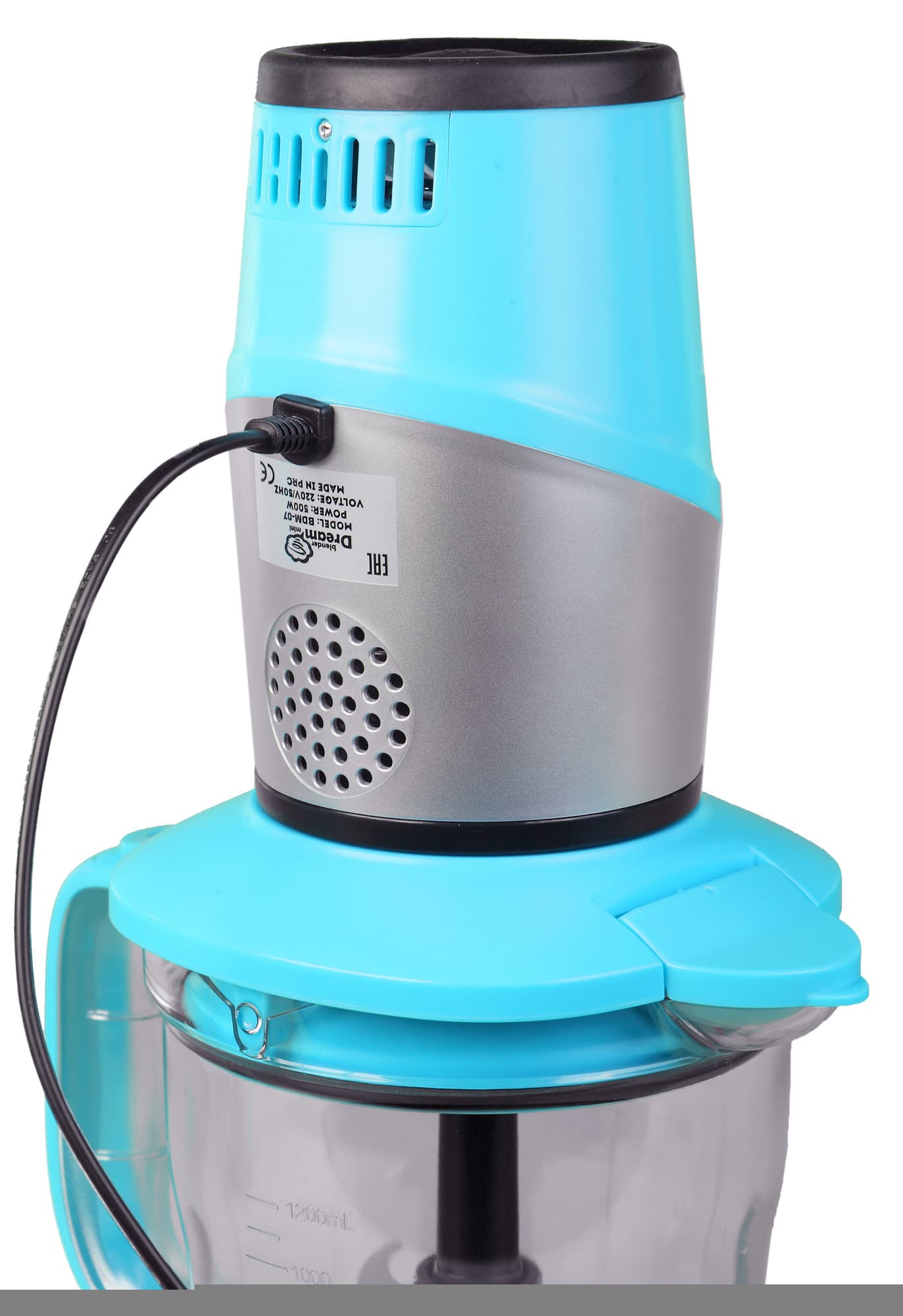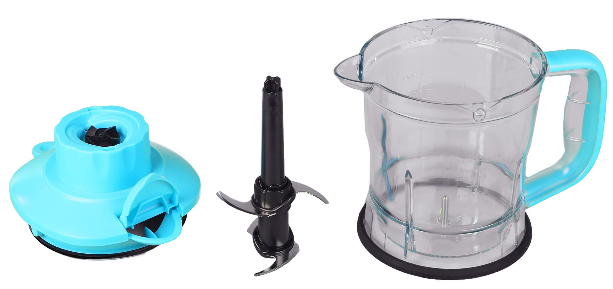 Моторный блок и все аксессуары производят впечатление качественно изготовленных. Прочный, отлично обработанный пластик, приятные цвета, небольшой вес сделают эксплуатацию блендера легкой и приятной. Моторный блок сделан в форме цилиндра со слегка бочковатой боковой поверхностью. В оформлении применены два цвета: голубой, повторяющийся в дизайне стаканов и емкостей, и нейтральный матово-серебристый.