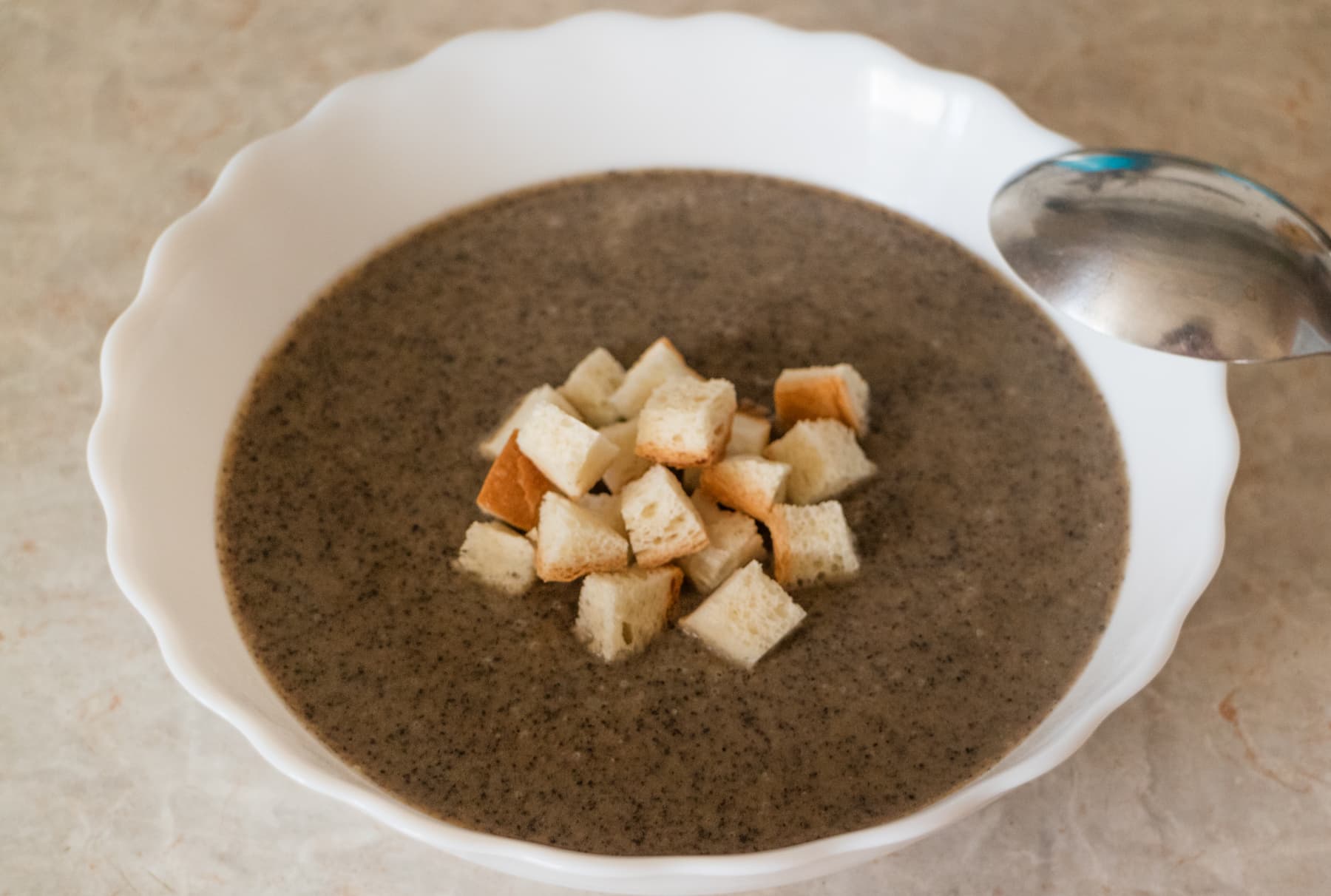 Обжарили репчатый лук и подготовленные шампиньоны. Параллельно отварили до готовности одну нарезанную на кусочки картофелину. В конце добавили обжаренные лук/грибы и сливки. Дождались остывания массы, т. к. инструкция советует перед перемалыванием остудить продукты до 80 °C. Перелили суп в чашу измельчителя и начали обработку. Объем продукта составил около 1 л. До консистенции супа-пюре масса дошла примерно за минуту. Перелили обратно в кастрюлю, добавили еще сливок, доведя густоту супа до желаемой, и прокипятили.