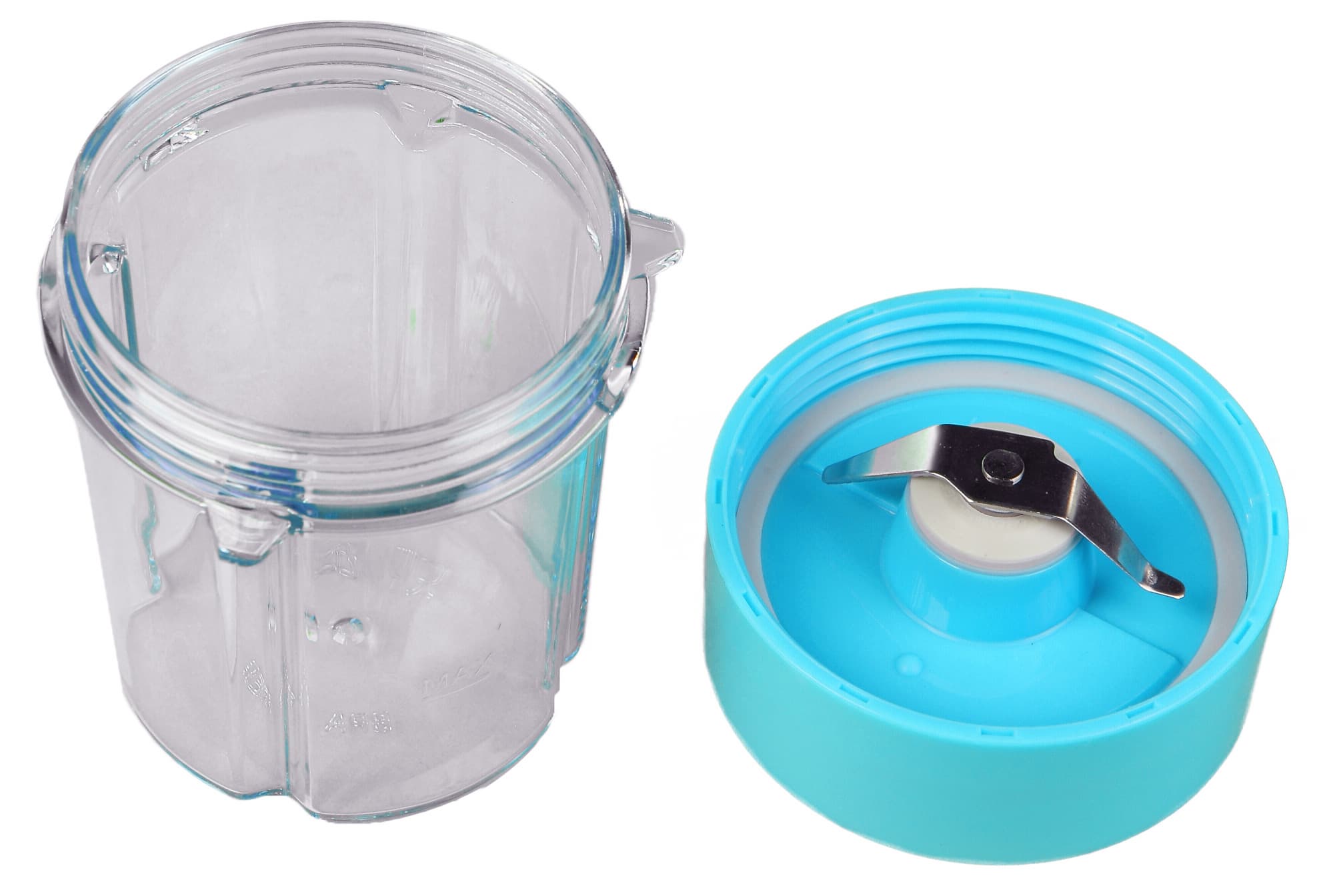 Все емкости мини-блендера изготовлены из прочного и безвредного тритана, устойчивого и к температуре, и к механическим повреждениям. Форма обоих спортивных стаканов идентична. На боковую поверхность надета резиновая вставка голубого цвета, на которой тиснеными буквами нанесены надписи. Благодаря материалу и тисненным буквам, стакан прочно удерживается в руке, не скользя даже во влажных ладонях. Обе емкости оснащены герметичными крышками, надеваемыми посредством закручивания по резьбе.