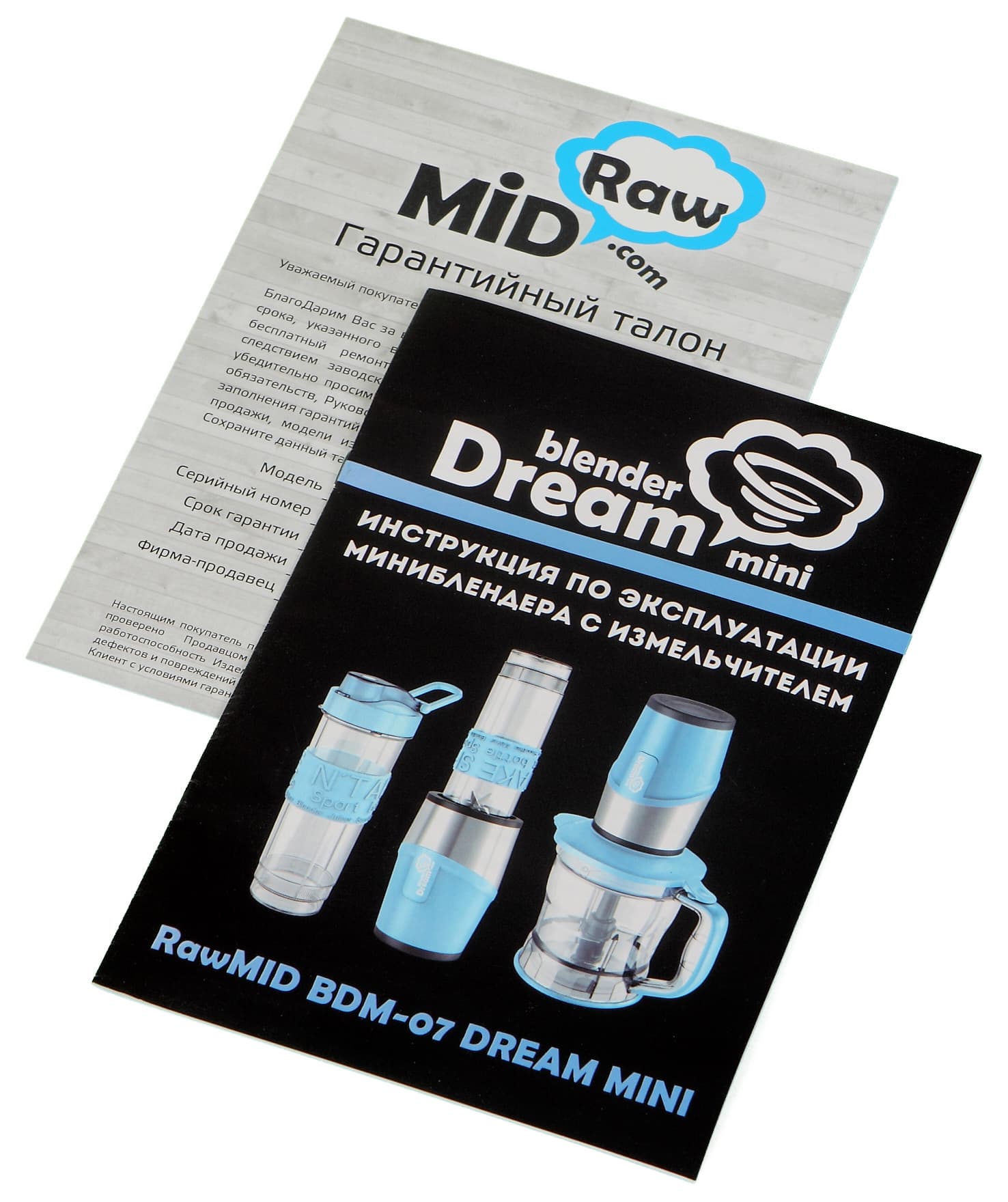 Никаких рецептов инструкция не содержит. В общем, краткое руководство лишь описывает особенности эксплуатации мини-блендера Rawmid Dream Mini BDM-07. Изучить документ имеет смысл один раз. Наиболее интересным и полезным нам показался раздел, посвященный максимально разрешенным объемам продуктов и времени измельчения
