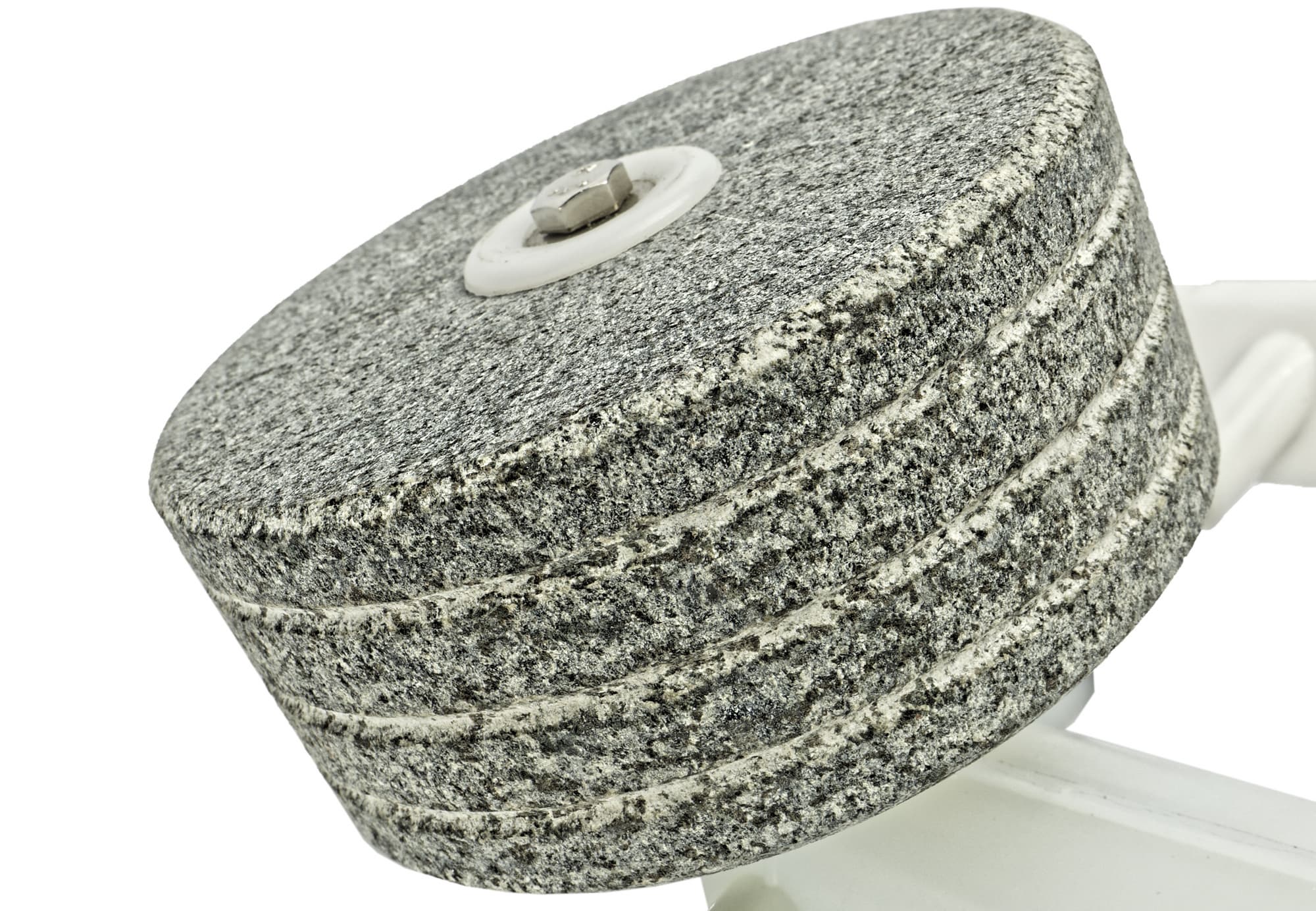 Дно слегка шершавое. Кстати, заострим внимание читателя на наличии радиальной борозды и многочисленных неглубоких спиральных бороздок на поверхности дна. Есть мнение, что эти бороздки позволяют продукту измельчаться более эффективно, так как нижний жернов в классической схеме должен быть снабжен целой системой борозд разной глубины и направления.