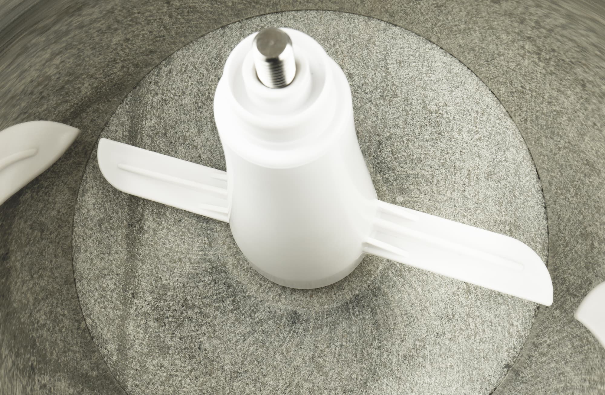 Со стороны дна привлекает внимание толстое кольцо, видимо, металлический утяжелитель для устойчивости конструкции. На кольце закреплены четыре мощные резиновые детали, играющие роль ножек. В целом меланжер стоит на столе весьма крепко и не производит впечатления прибора, способного передвигаться под действием вибрации.