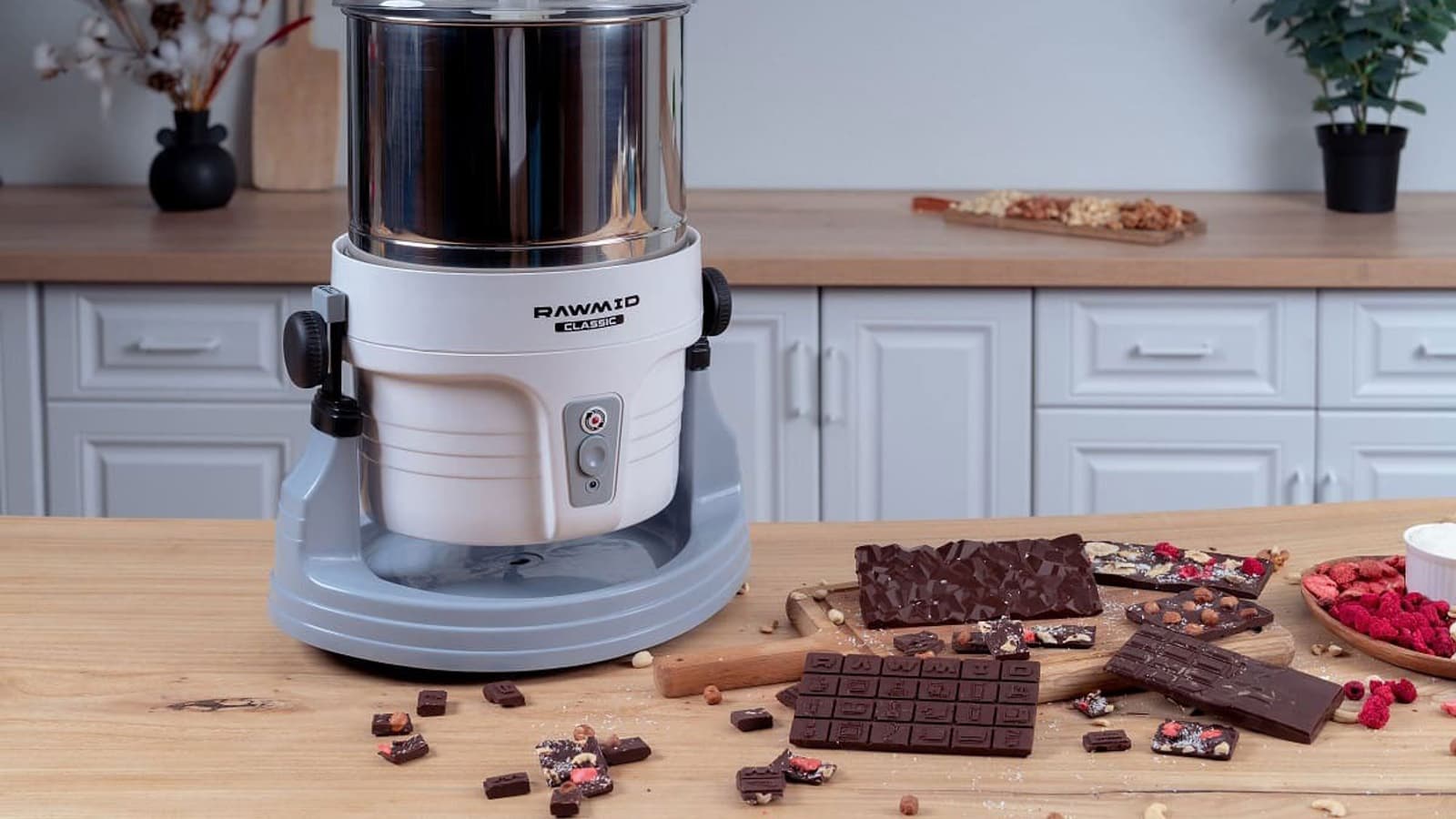 По описанию компании-поставщика, Rawmid Classic RCM-02 — аппарат не столь узкоспециализированный, как может показаться на первый взгляд. В целом, результаты тестирования его предшественника это подтвердили. С помощью меланжера можно не только готовить чрезвычайно нежный шоколад, но и замешивать тесто, молоть кофе и специи, а также приготовить муку из круп, ореховые пасты, урбечи, тахини и фруктово-ягодные пюре. Вперед, читатель, посмотрим на гранитные жернова в действии!