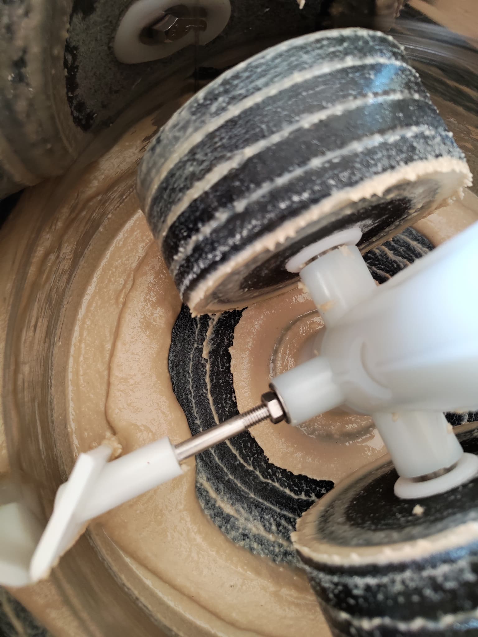 Через 15 минут зерна были перетерты в еще неоднородную, но уже липкую массу. Добавили еще треть кунжута, посмотрели, как равномерно и массово они уходят под жернова, вздохнули и досыпали остальное. Вообще, хочется отметить, что наблюдение за работой меланжера — занятие крайне залипательное. Белье в барабане стиральной машины против созерцания измельчаемых зерен — это привычный гул автомобилей за окном в сравнении с самым популярным ASMR-видео. Поэтому мы буквально усилием воли заставляли себя отойти и оставить прибор в покое.