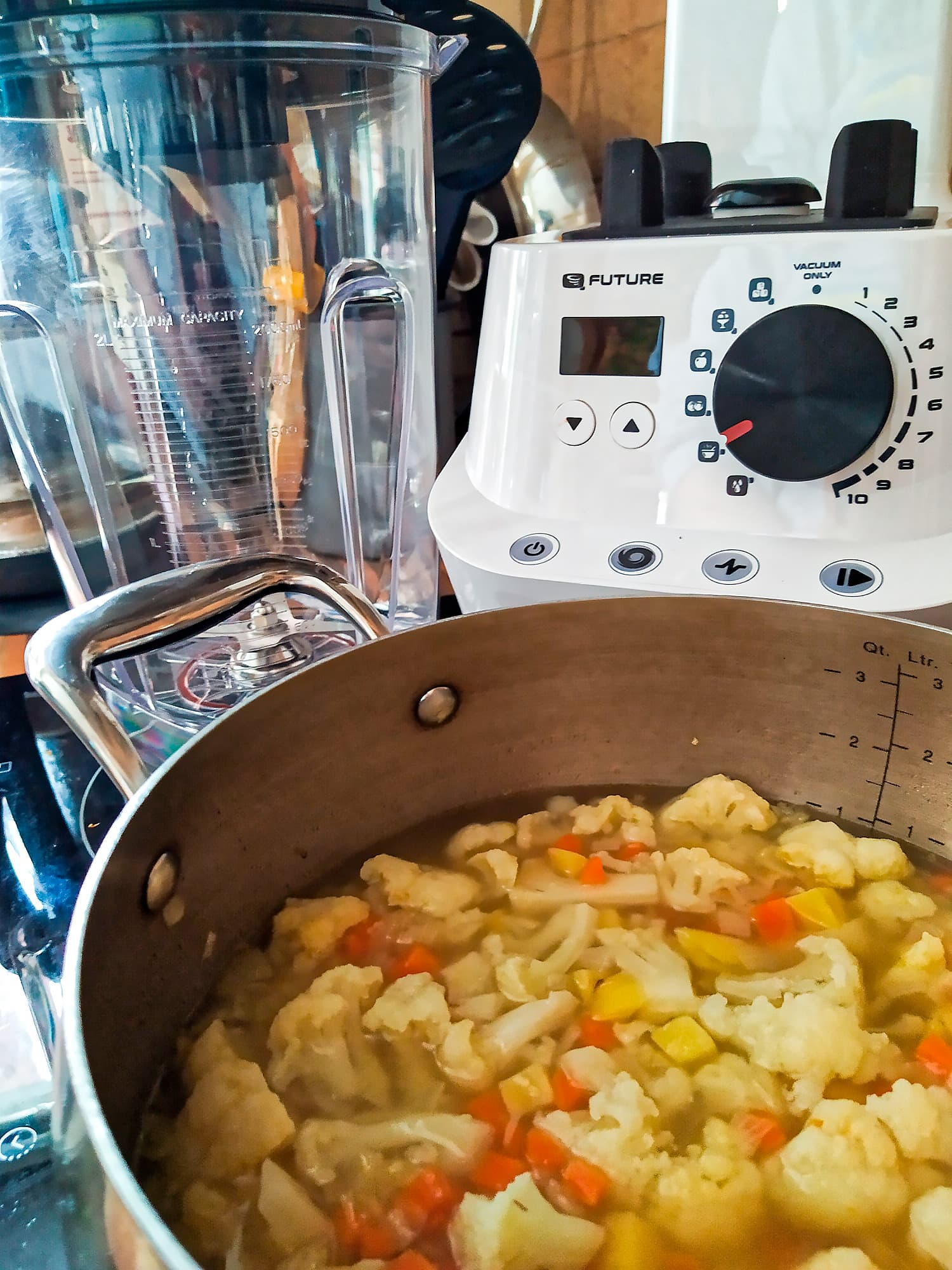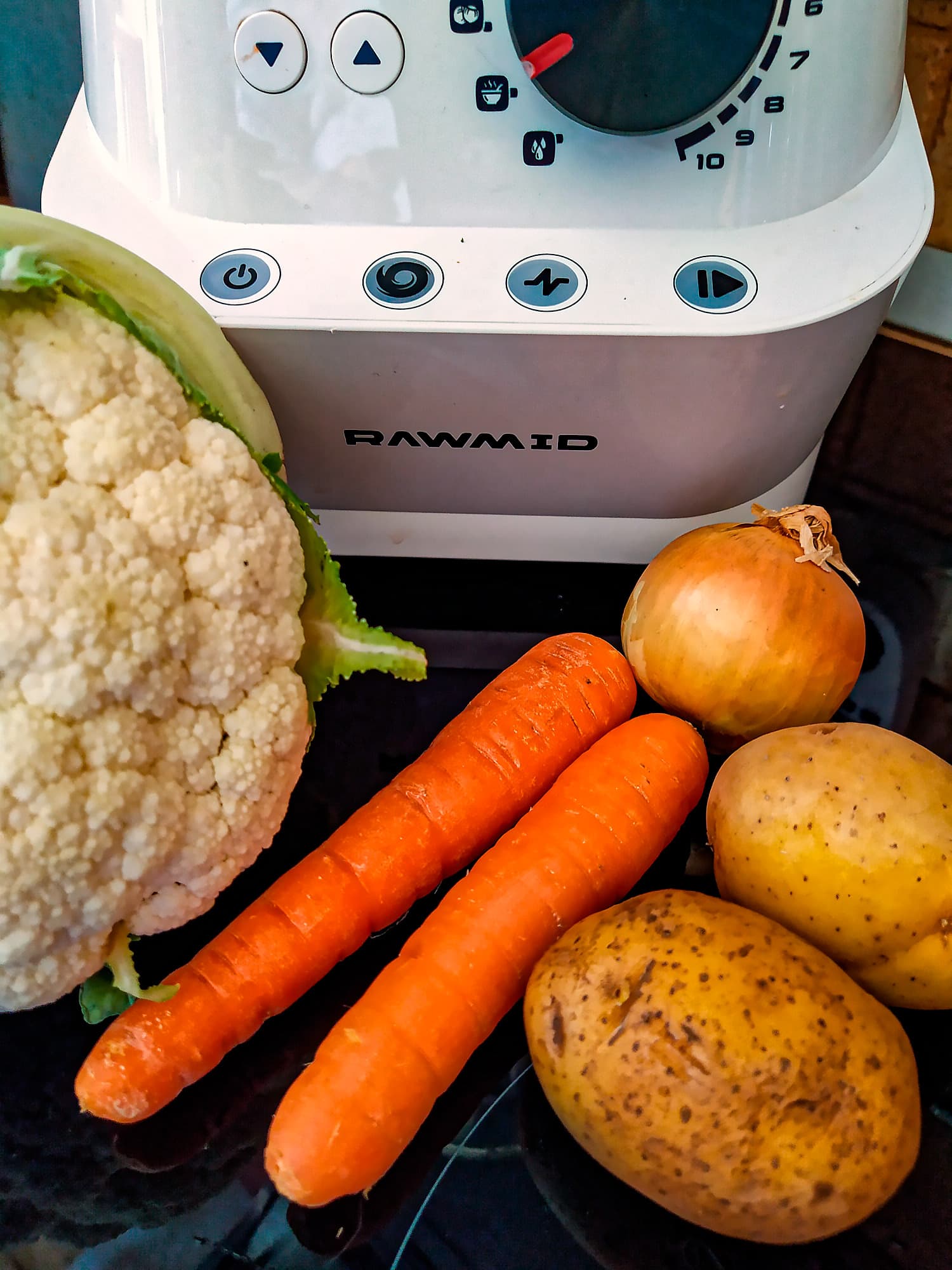 Мы уже опробовали режим «Суп», но блендеру тогда пришлось работать вполсилы: основная часть сырья уже была измельчена. Проверим, как RFB-02 проявит себя, если мы немного усложним задачу. Приготовим крем-суп из цветной капусты с овощами.