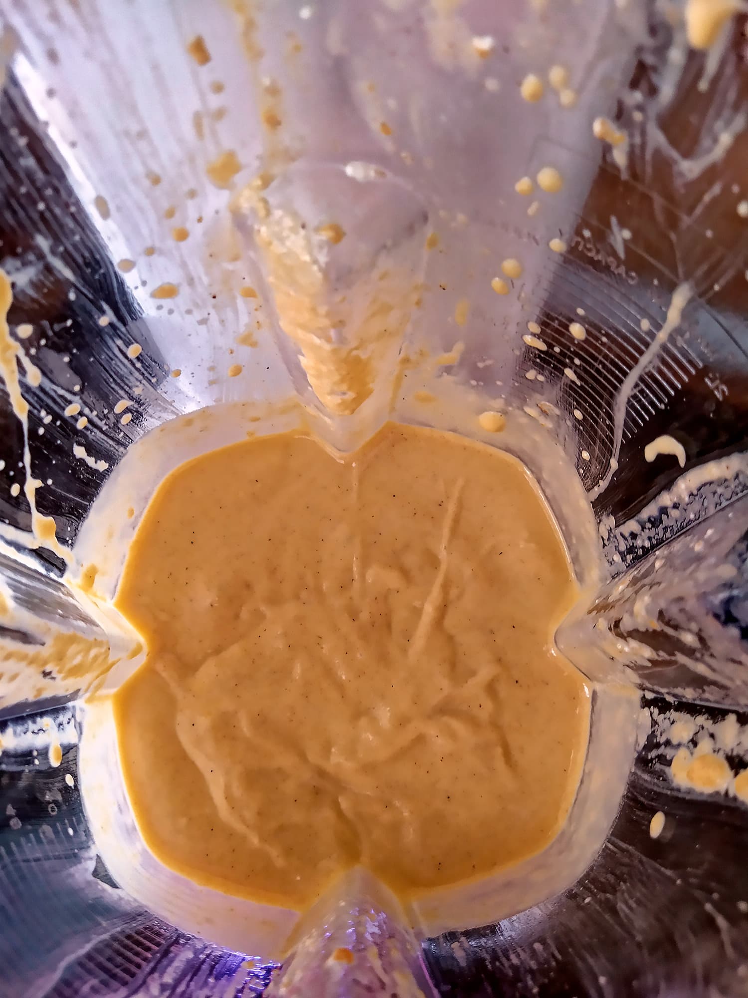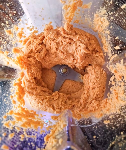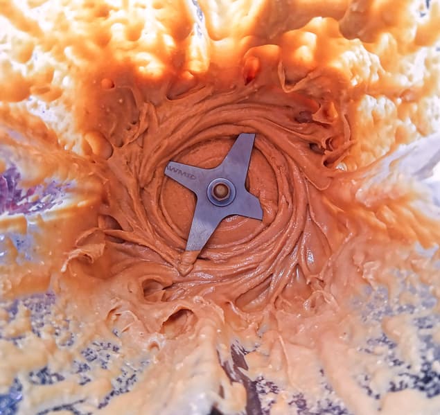 Пасту можно готовить только в ручном режиме и обязательно при участии толкателя — так мы и сделали. Запустили блендер на второй скорости, затем постепенно перешли к восьмой. Поначалу толкатель лежал без дела, но довольно скоро «орехи» из крошки стали превращаться в маслянистую массу — и вот тут он пригодился. Паста расползалась по стенкам, так что толкатель нужен для того, чтобы направлять ее обратно в сторону ножей.