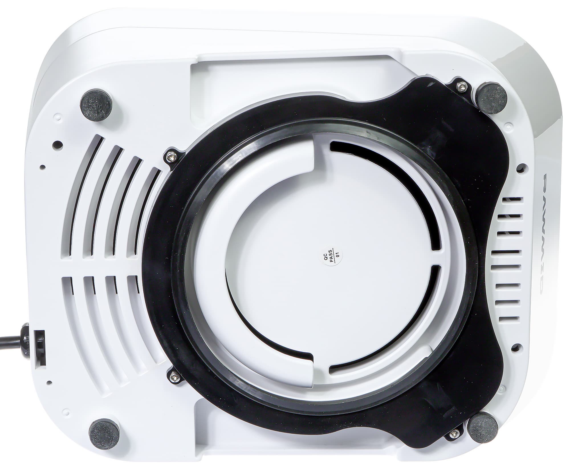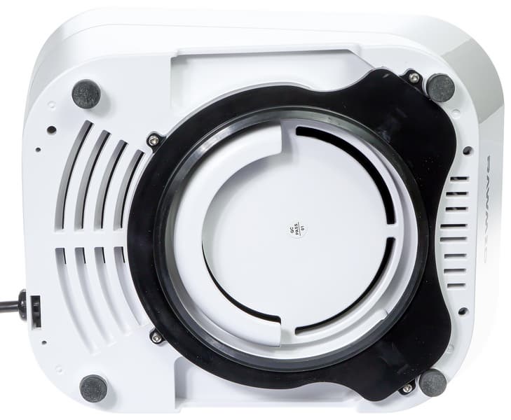 На дне корпуса — вентиляционные отверстия и 4 прорезиненные ножки, которые кажутся слишком миниатюрными для такого внушительного прибора, но на деле оказываются настоящими стоиками и берут заданный вес как опытные тяжелоатлеты.
